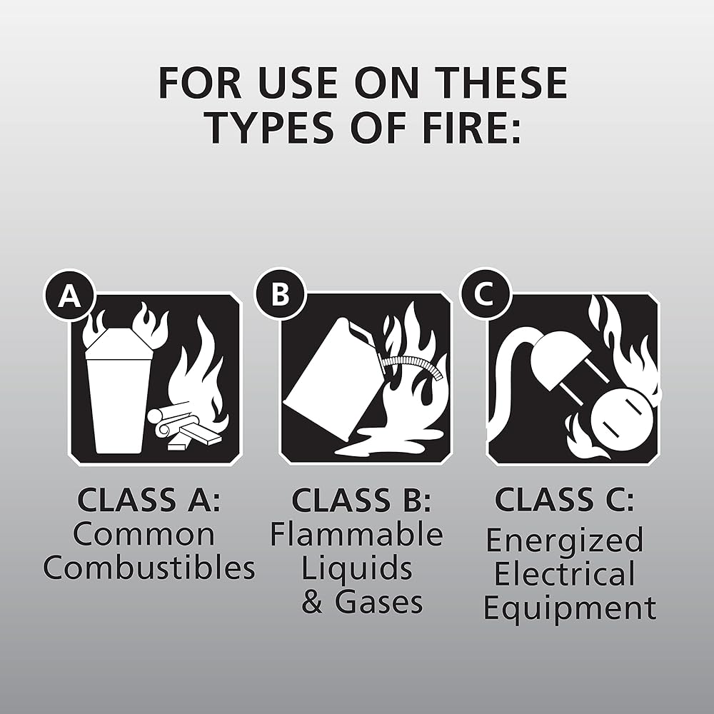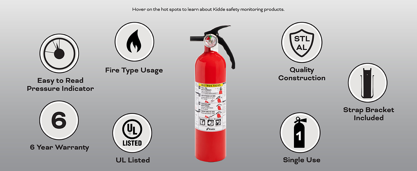 The Kidde Fire Extinguisher for Home, 1-A:10-B:C, Dry Chemical Extinguisher is a general-use fire extinguisher designed to fight basic fires common to the home including those involving trash, wood, paper (Class A), liquids and gases (Class B), and electrical equipment (Class C). Manufactured from lightweight aluminum with a tough valve assembly, and fitted with a pressure indicator that is easy to read, the Kidde fire extinguisher is a basic, multipurpose fire extinguisher that you can use in your house or car. Rust-resistant and impact-resistant, the Kidde home fire extinguisher Includes an easy-to-pull safety pin, a clear instruction label that is bilingual, and UL-approved strap brackets for easy mounting. The Kidde Fire Extinguisher adds an extra element of safety to your home by providing 2.5 pounds of monoammonium phosphate, a fire extinguishing agent. Perfect to aid in residential firefighting. Single-use only. UL rated. 6-year limited manufacturer's warranty.