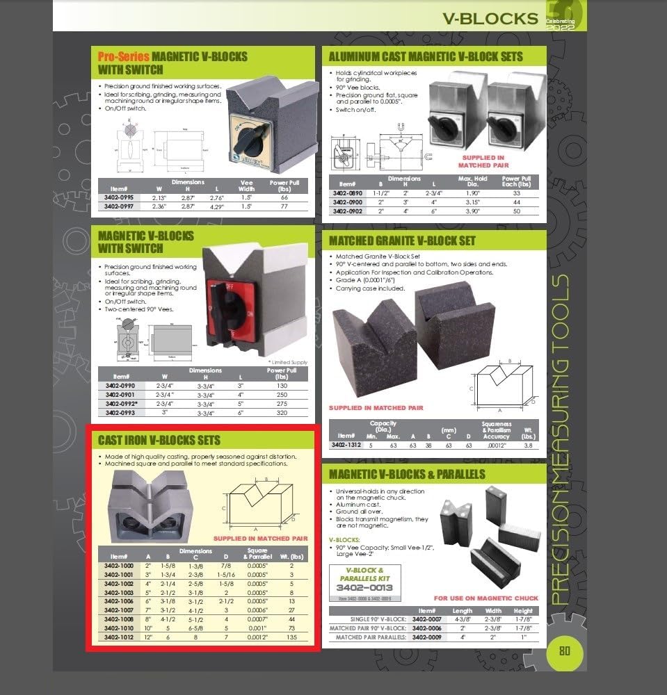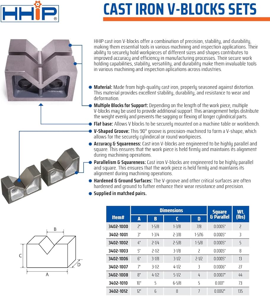 3 X 1-3/4 X 2-3/8" Cast Iron V Block Set (3402-1001) ~ Made of high quality casting, properly seasoned against distortion. ~ Machined square and parallel to meet standard specifications. ~ Supplied in a matched pair. ~ A is 3". ~ B is 1-3/4". ~ C is 2-3/8". ~ D is 1-5/16".