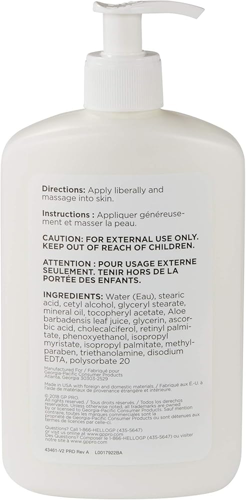 Contains emollients and conditioning agents to help moisturize dry skin. Formulated with Aloe Vera and natural skin conditioners and antioxidants of Vitamin A, C and E. pH balanced to the skin – gentle with frequent use for hand and body. Absorbs quickly. Dermatologist-tested. Fragrance-free. Ideal for healthcare, foodservice and other frequent-hand washing end-users.