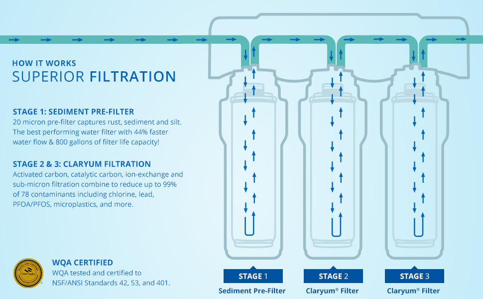 Instant access to healthy water that keeps you and your family hydrated all day, every day. Reduces up to 99% of 78 contaminants including lead, mercury, asbestos, pesticides, microplastics, pharmaceuticals, chlorine, chloramines and more. Full system WQA tested & certified in 2023 to NSF/ANSI Standards 42, 53, and 401. The only system on the market with Claryum filtration technology that filters out harmful contaminants while retaining natural beneficial minerals like calcium and potassium. Healthy water at only 10 cents per gallon the included sediment pre-filter increases performance capacity to give you a full 800 gallons of healthy water. Zero additives and zero waste - no water is wasted during the filtration process and no harmful contaminants are added back into the water. Drink healthier water and use for better tasting beverages like coffee, tea, and smoothies. Enjoy better tasting food - steamed vegetables, rice, boiled pasta, soups. Even your pet can now benefit from healthier water. Includes stylish metal faucet that's 100% lead free. Choose from chrome, brushed nickel, or oil-rubbed bronze to match your kitchen decor. First set of filters, faucet, and all system parts included. DIY installment makes for easy installation. Replacements are a simple twist - keep your plastic housing and only toss the filter.
