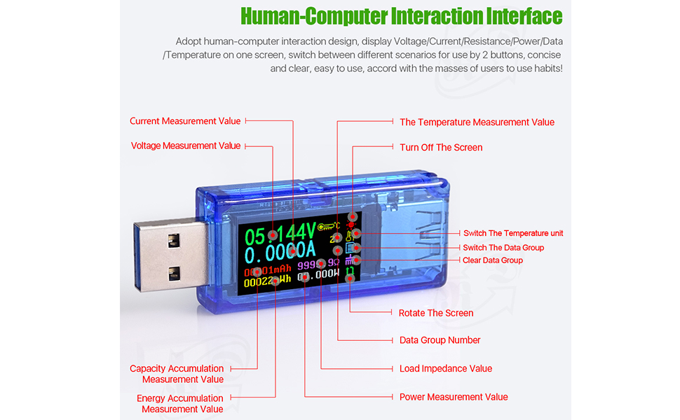 متعدد الوظائف: يمكن استخدام مقياس USB الرقمي الذكي لاختبار الجهد والتيار والسعة ودرجة الحرارة وتسجيل حالة الشحن وما إلى ذلك. بيانات LCD في لمحة، واكتشف معدات 3C التي تستخدمها في الوقت الفعلي لتجنب مسحها بشكل غير متوقع.