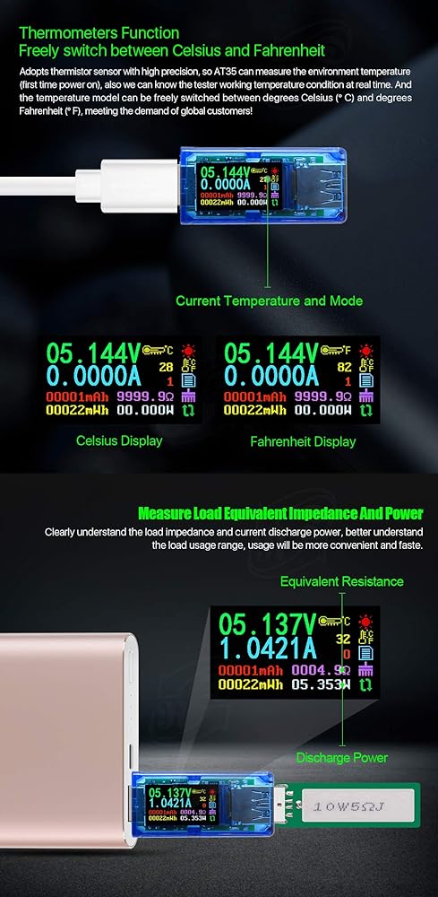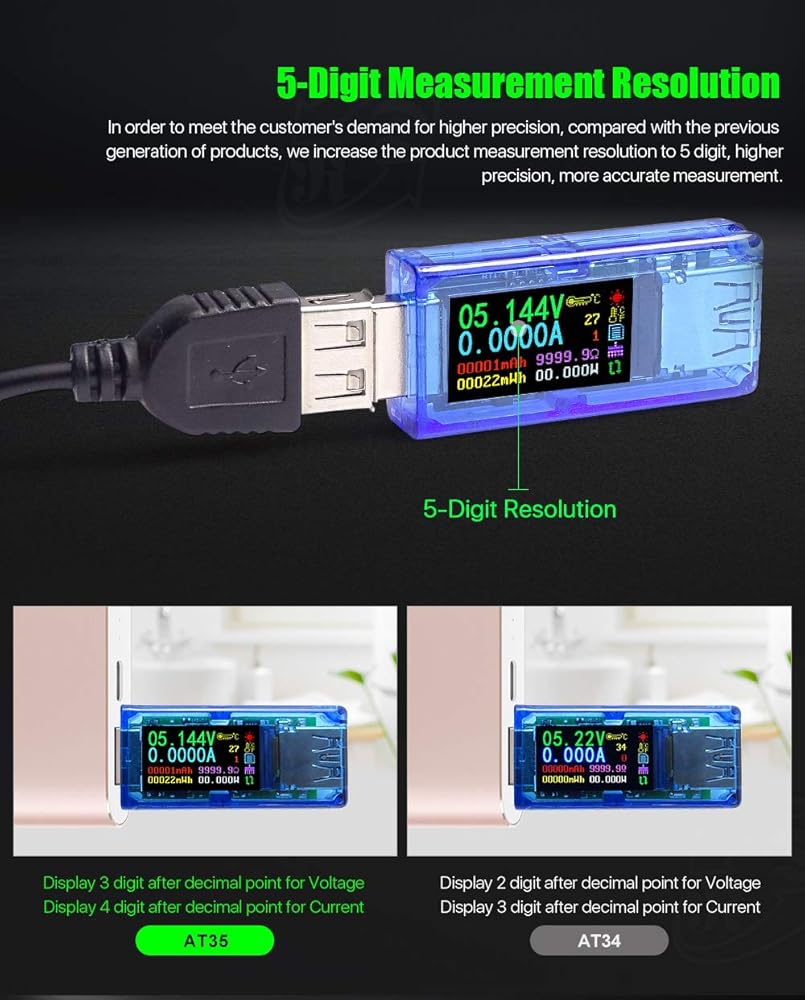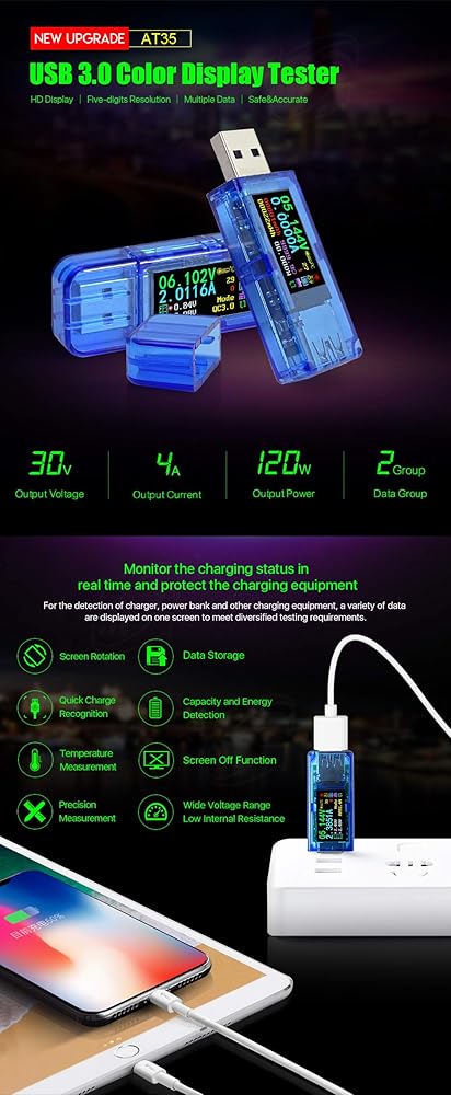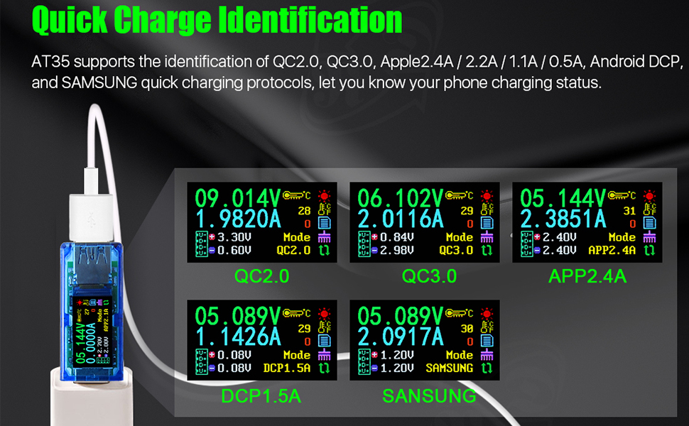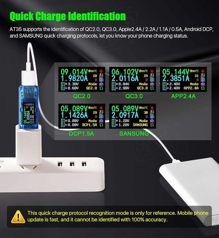 يستخدم AT35 شاشة LCD ملونة عالية الوضوح مقاس 0.96 بوصة IPS لعرض حالة شحن الجهاز والجهد والتيار والسعة والطاقة والمقاومة المكافئة ودرجة الحرارة والمؤشرات الأخرى في لمحة. زاوية عرض واسعة 160 درجة، سطوع عالي وعمر عمل طويل. التعرف السريع على الشحن، متوافق على نطاق واسع: AT35 يدعم QC2.0، QC3.0، i Phone 2.4A/2.1A/1A/0.5A، Andriod DCP، تحديد بروتوكول الشحن السريع، يتيح لك معرفة حالة شحن الهاتف. نشوئها