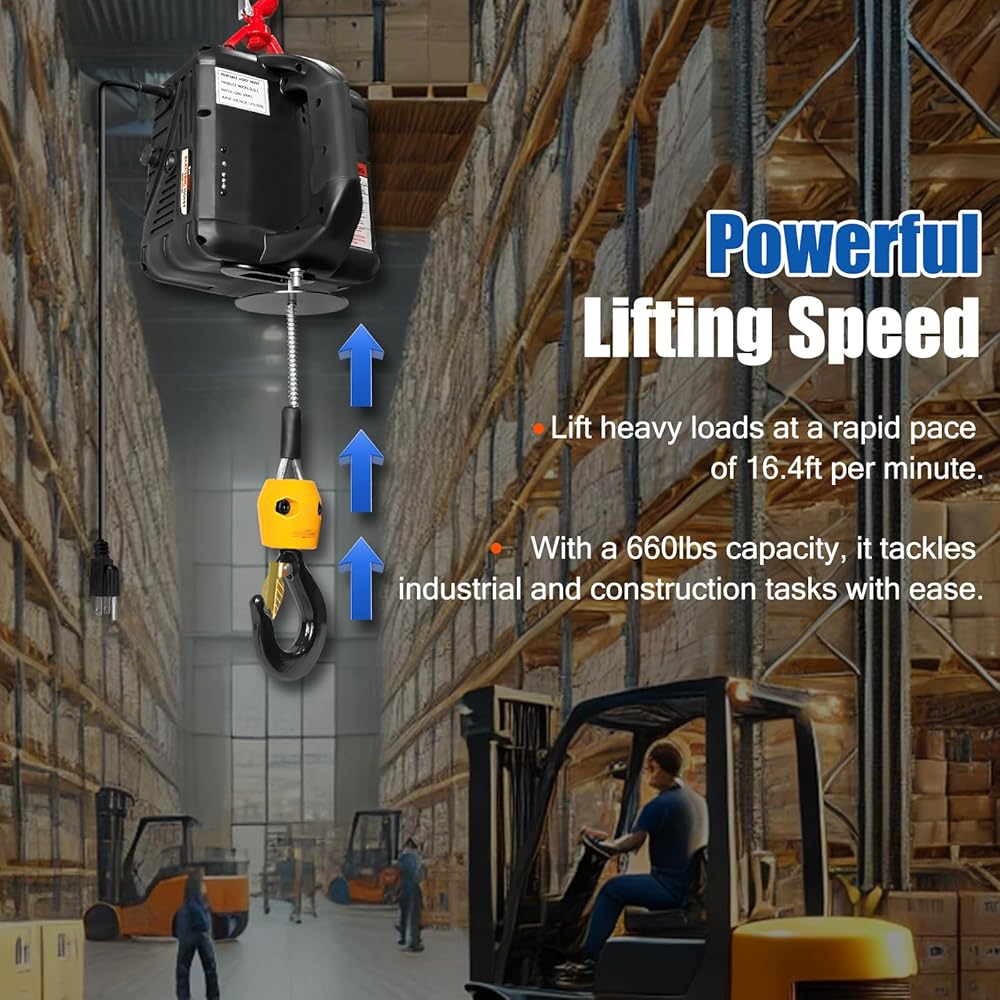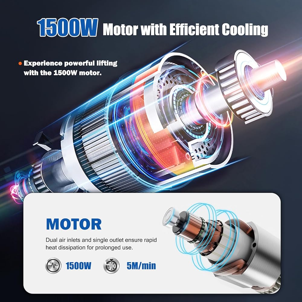 💪[ Powerhouse Performance ] -- Elevate your efficiency with our 1500W all-copper motor. This powerhouse delivers a consistent lifting speed of 16 feet per minute, allowing you to tackle the most demanding tasks effortlessly. Experience unmatched performance that saves time and increases productivity.