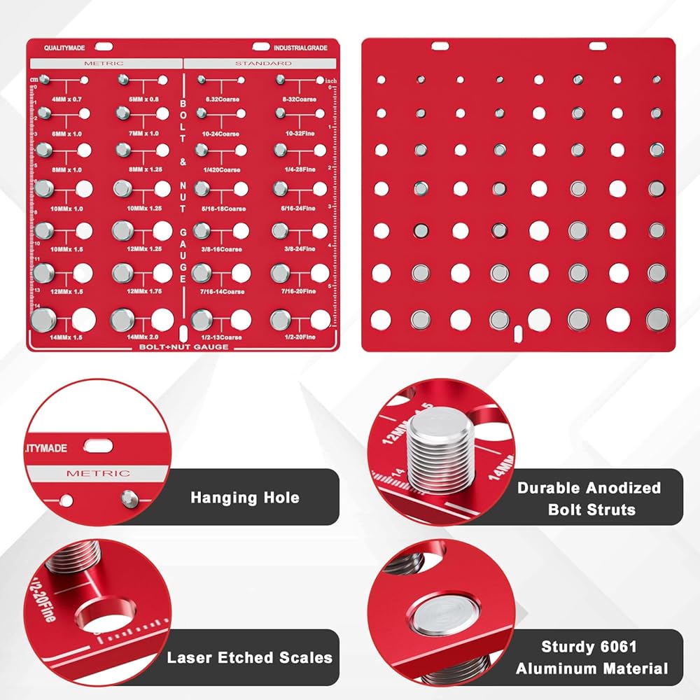 【Strong and Wear-resistant】: Nut and Bolt Thread Checker Gauge is made of 6061 aluminum alloy, all struts are made of durable 304 stainless steel, the surface is oxidized, rust-proof threaded pins are securely fixed in the holes of nuts and bolts to identify the gauge, more solid and durable!