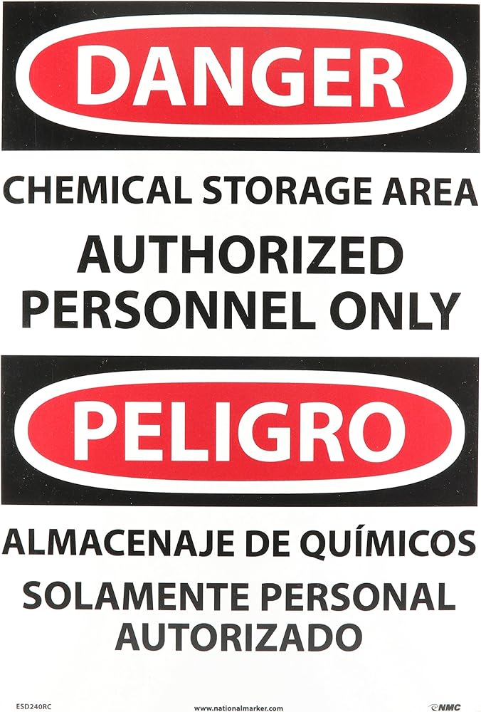 NMC Bilingual OSHA sign is the perfect way to alert your employees and guests when a hazard is present in your facility. These OSHA signs comply with OSHA 29 CFR 1910.145. Pressure sensitive vinyl 0.0045 (PSV) material has pressure sensitive adhesive backing and is flexible, which allows for mounting on smooth, curved or irregular surfaces. It is long-lasting for indoor labeling. Mounting: yes. Good chemical resistance. Maximum temperature: 178 degrees F. Measures 10-inches length by 14-inches height. Legend "DANGER CHEMICAL STORAGE AREA AUTHORIZED PERSONNEL ONLY".