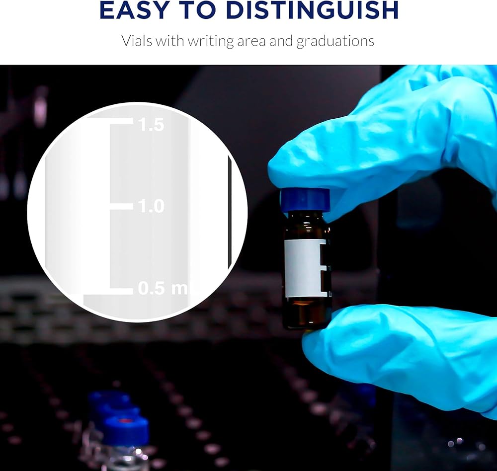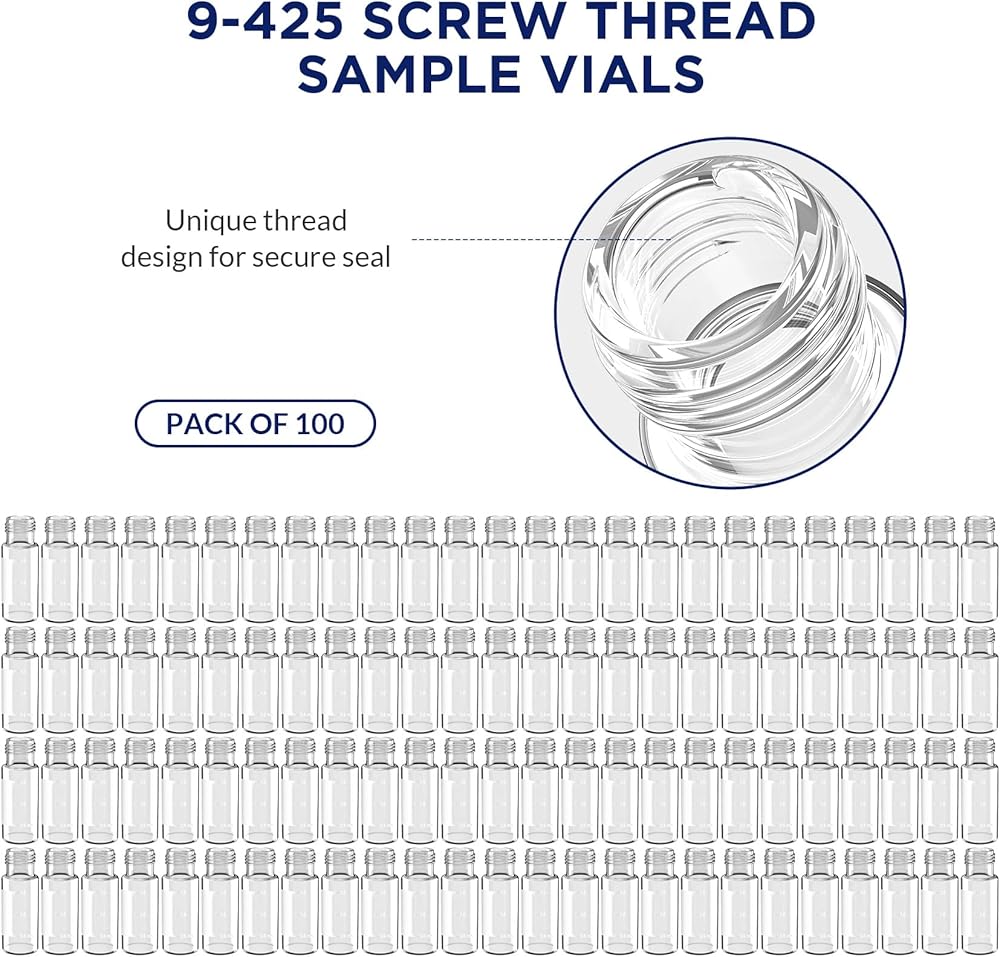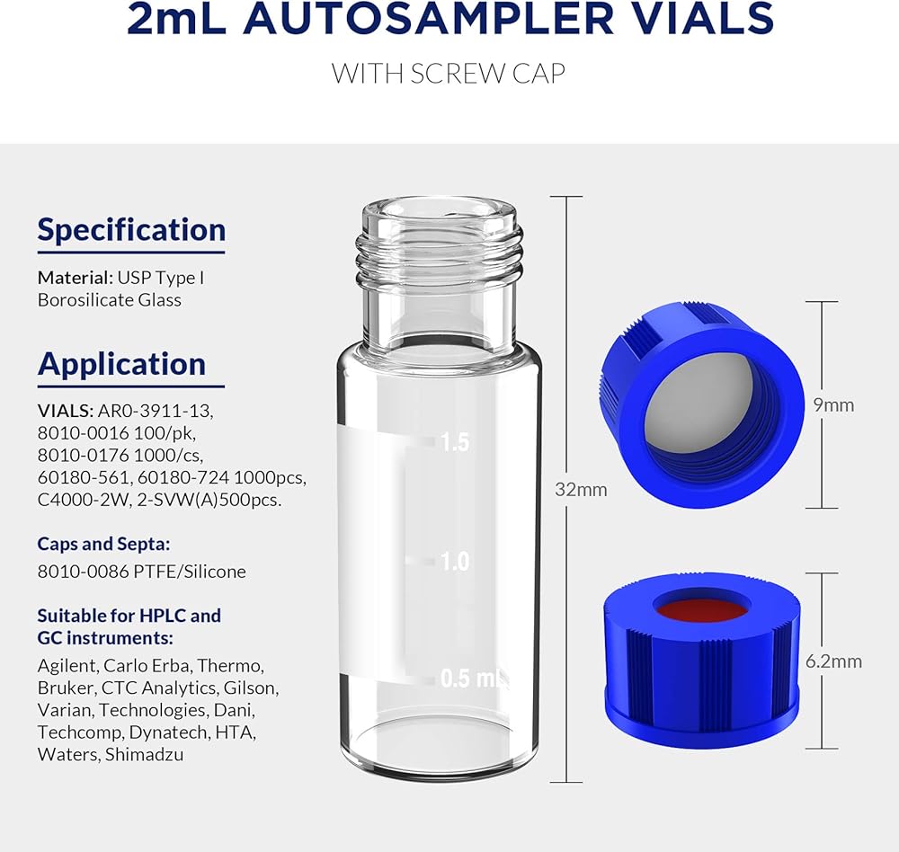🧪 DIMENSION - These sample vials closure size of 9mm, Diameter outer 12mm, Height 32mm, Vial Volume 2ml, compatible with Agilent (1042, 1050, 1080, 1082, 1084, 1090, 1100, 5890, 6850, 6890, 7670A, 7671A, 7672, 7673A/B, 7683, 7890, 8042, etc.), Shimadzu, Bruker (8100/8200, Marathon), Varian(Marathon), Waters, Thermo, etc.