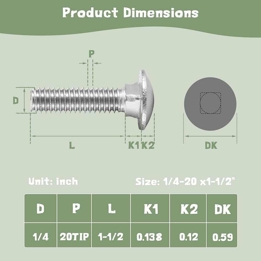 【Perfect Size】Our 1/4 carriage bolt heads are approximately 0.59 inches (15 mm) in diameter, with a rounded head height of approximately 0.14 inches (3.5 mm) and an overall screw length, including the neck, of approximately 1-1/2 inches (38 mm); their precise dimensions ensure reliability and stability with a wide variety of applications.