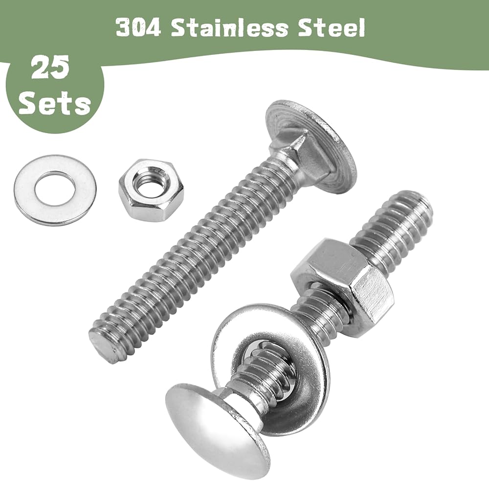 【What You'll Get】You will receive 25 stainless steel carriage bolts (1/4-20 x 1-1/2"), 25 hex nuts (1/4"-20), and 25 flat washers for your everyday use and replacement,ensuring reliable, sturdy structural support for a variety of applications!