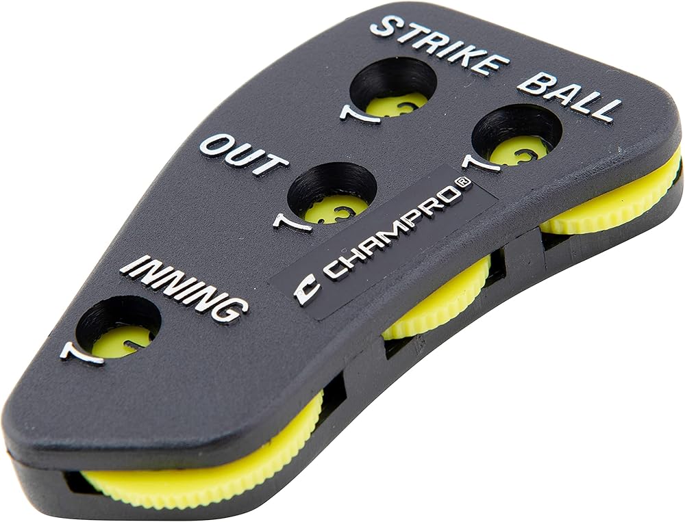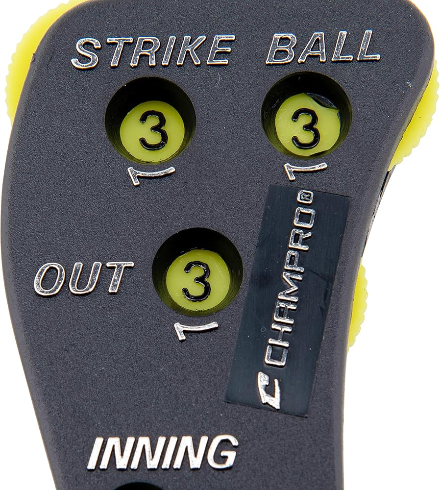 4-DIAL INDICATOR: Includes 4 dials to keep track of strikes, balls, outs, and innings. Tracks balls 0-4, strikes 0-3, outs 0-3, and innings 0-9.