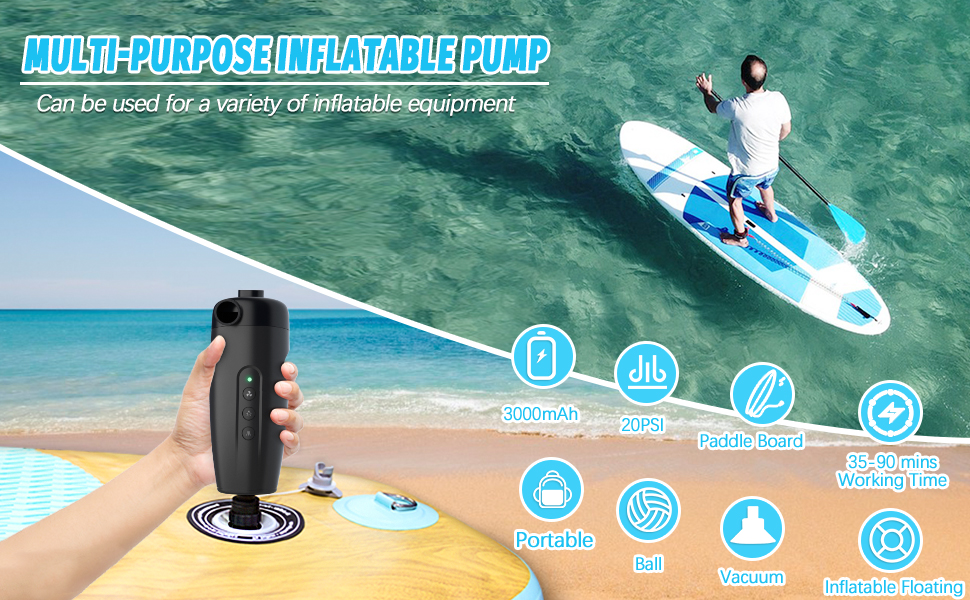 Portable Electric Air Pump for Inflatables, 20PSI Rechargeable Sup Air Pump for Paddle Board with 3000mAh Battery, Inflate Deflate for Air Mattress Beds, Boats, Pool Floats, Swimming Rings, Balls