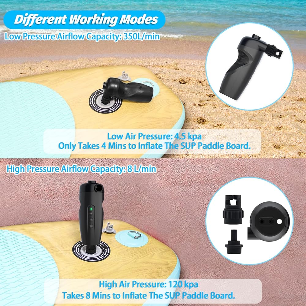 20PSI High Pressure: Powerful high-pressure air pump designed for quickly inflating SUP paddle boards, inflatable boats, airbeds. It can inflate up to 20 PSI, ensuring that your items are inflated to the correct pressure level for optimal performance