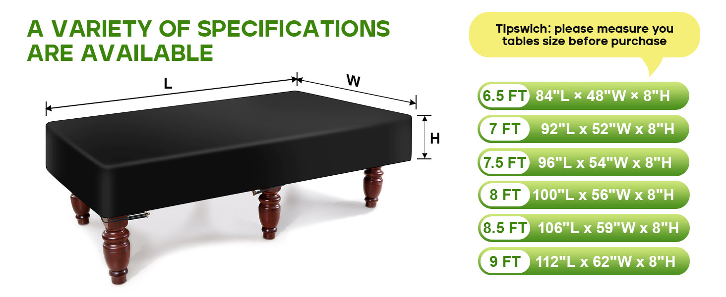 📏[FITTED SIZE]: The size of the fitted table cover for 8.5 foot table is106"L×59"W (Edge to Edge). Please be sure to measure your pool table before purchasing the cover. If you're stuck in between sizes or aren't sure which size to buy, we recommend that you choose to go one size up. It also works well for other types of gaming tables.