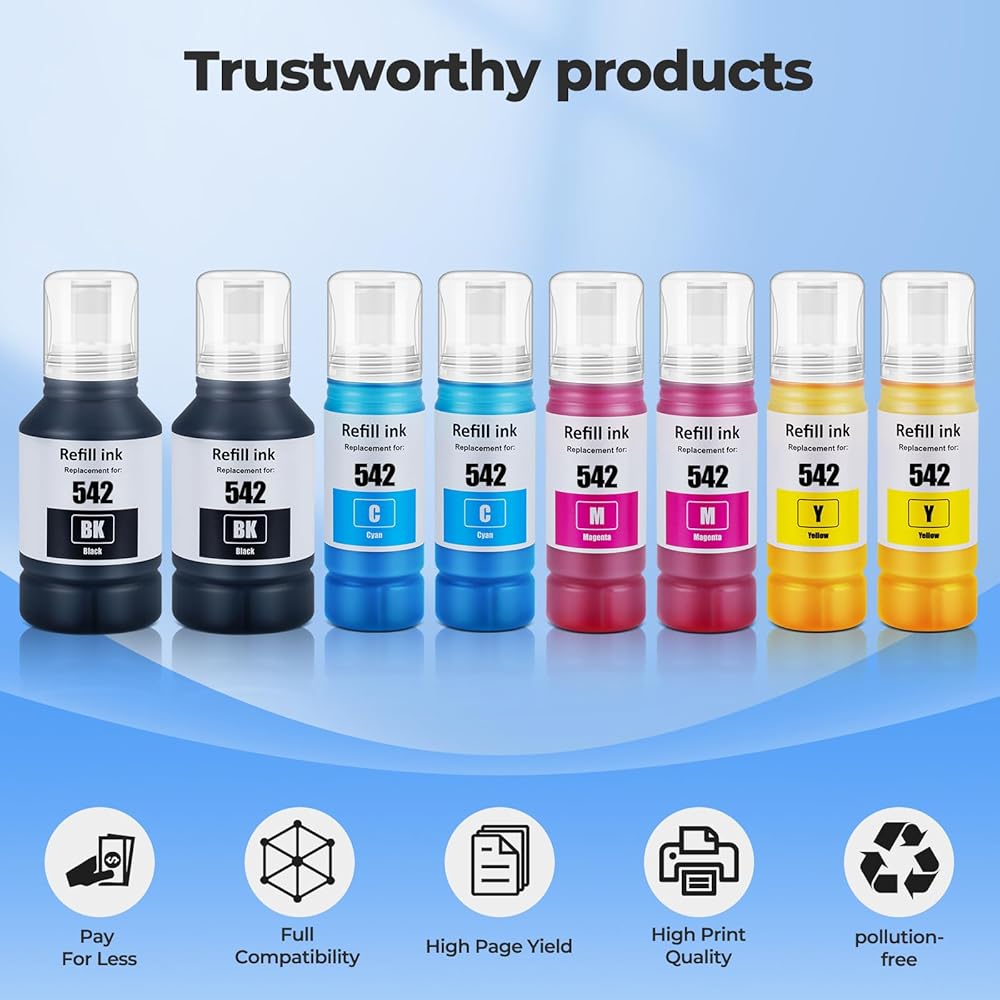 【Excellent Quality】:Replacement for epson 542 ink refills new upgraded formula ink, with the strictest quality testing, the ink is smooth and uniform, not clogging, not fading, not showing ink, and quickly drying, ensuring smooth and clean printed text and vivid image colors.