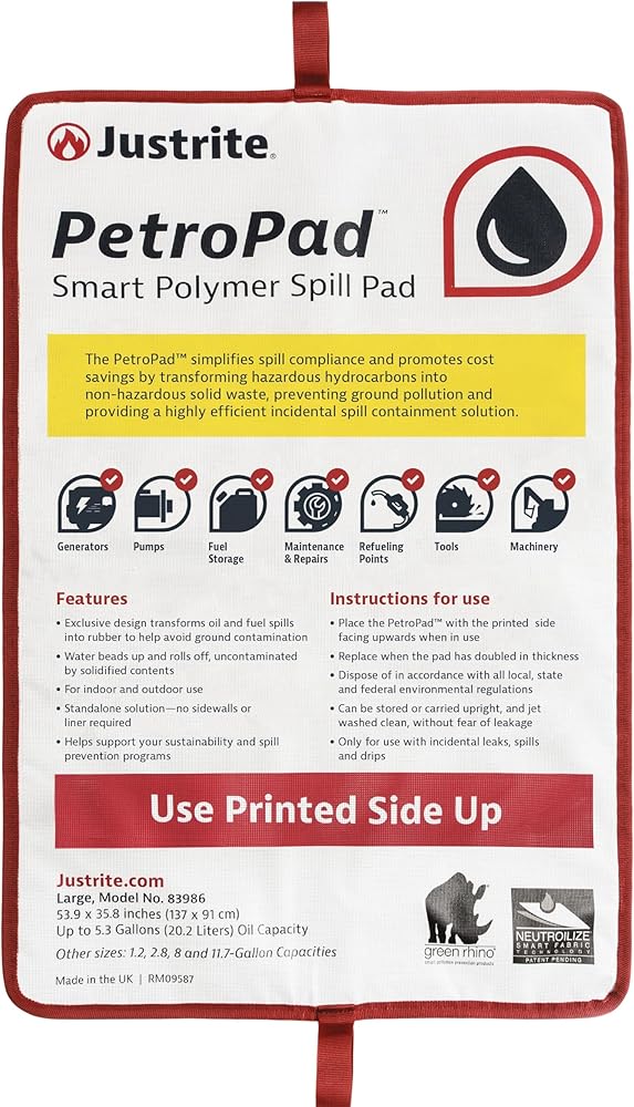 Don't let leaky equipment and refueling mishaps wreak havoc leaving you with an oily mess. Be proactive when working with oil-based chemicals that might cause a spill, splatter, or drip, and stay compliant with industry EPA regulations by using the game-changer - The PetroPad oil drip mat. The PetroPad's Smart Polymer oil mats are uniquely designed to absorb and permanently solidify hydrocarbons like oil, diesel, and gas. The exclusive blend of polymers found in these absorbent pads for spills safely converts hazardous hydrocarbons from incidental spills and leaks into a non-hazardous solid. Reusable, portable, washable, and easy to dispose of, the PetroPad is a highly flexible and cost-efficient solution for safely handling and disposing of hazardous hydrocarbon waste. The oil spill absorbent pads use a smart polymer embedded in a geotextile fabric. This innovative technology quickly absorbs and solidifies hydrocarbons, trapping the pollutants inside the pad. This allows uncontaminated water to pass through, reducing the volume of pollution and hazardous waste for disposal. Its robust construction and durable materials stand up to rough handling and treatment. To remove built-up dirt and debris, simply pressure wash it. When used correctly in many cases a full PetroPad may not be considered hazardous waste and can be disposed of in a landfill. In all instances make sure to dispose of in accordance with all local, state, and federal environmental regulations. Justrite is the exclusive supplier of the PetroPad oil absorbent mat in the United States through a partnership with Green Rhino, a leading supplier of pollution prevention products based in the UK. Founded in 1906, Justrite is a leading manufacturer of storage, handling, and workplace safety products. Today, Justrite is a global leader in the design and manufacturing of products for the safe management of flammable liquids and hazardous materials.