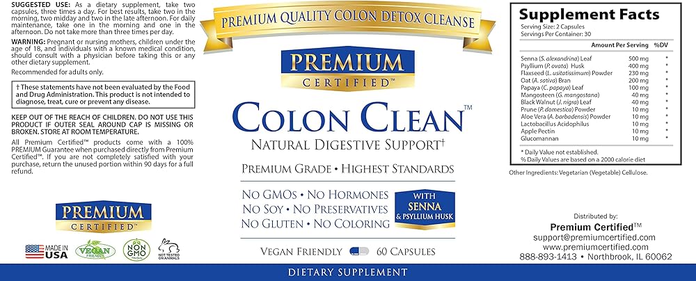 Premium Certified Colon Clean contains the highest quality ingredients selected based on clinical research. Natural ingredients plus a probiotic gently cleanses the digestive system for better gut health.