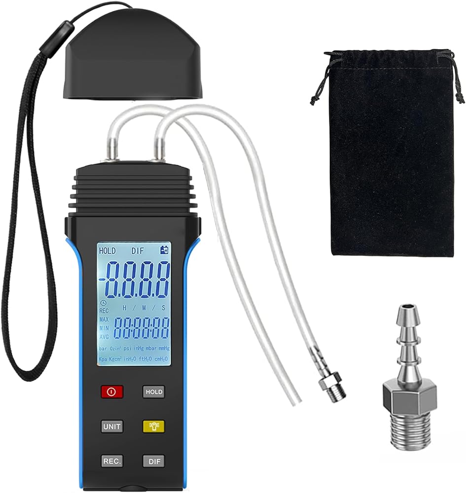 🏷【11 Units Available】This differential manometer has 11 built-in units available: inH20, psi, bar, mbar, kPa, inHg, mmHg, Ozin2, ftH20, cmH20, kgcm2.