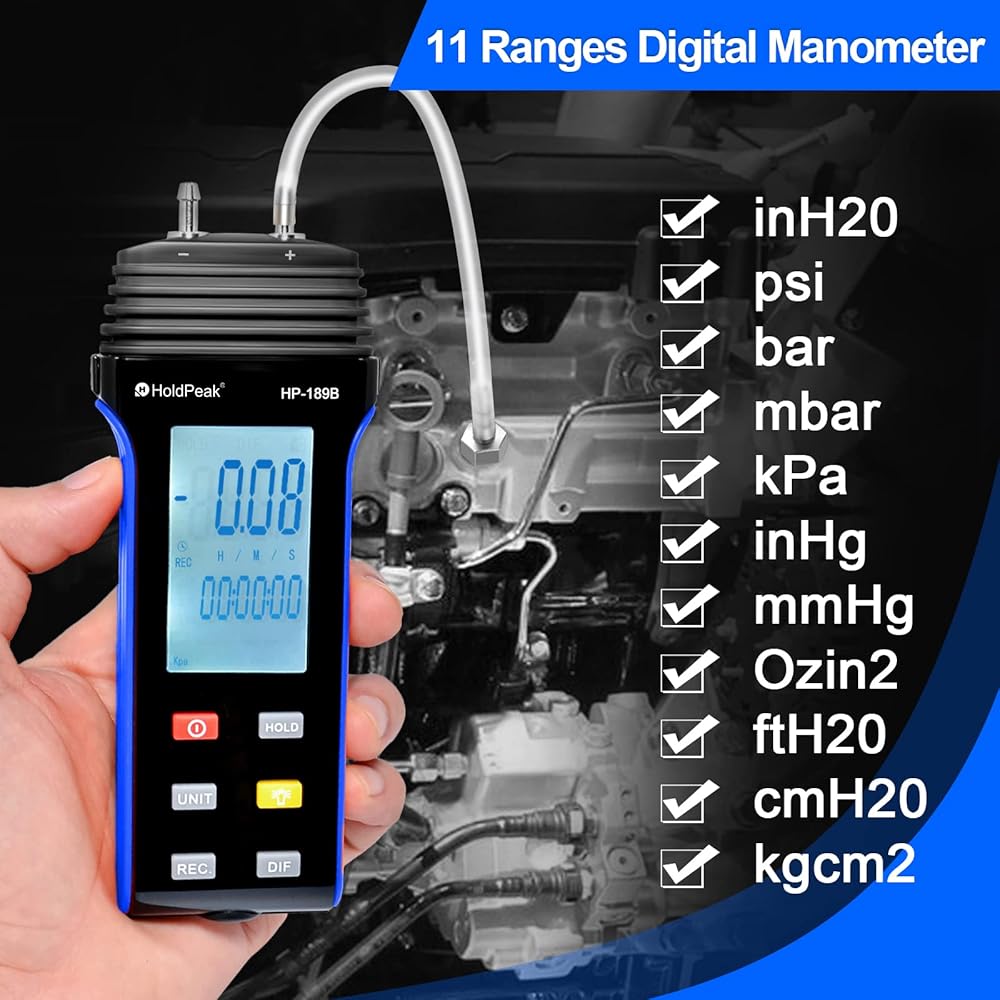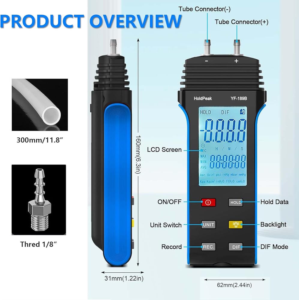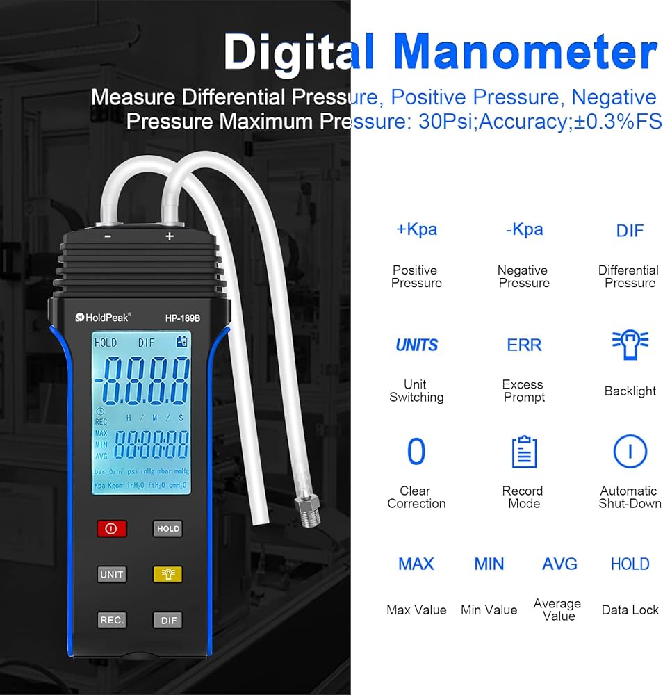 🏷【High Precision Pressure Gauge】HP-189B uses high-quality pressure sensor, which can be used to measure differential pressure, positive pressure and negative pressure. Wide Range: ±206.8kPa/30.00Psi , accuracy: ±0.3%FS. The measurement is accurate, fast and sensitive.