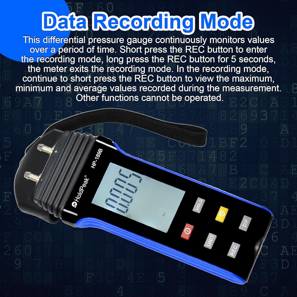 🏷【Complete Functions】HP-189B digital gas pressure tester is easy to operate, with practical functions such as over-range prompt, MAX/MIN/AVG, data hold, data record, difference display, backlight, low battery prompt and automatic shutdown.