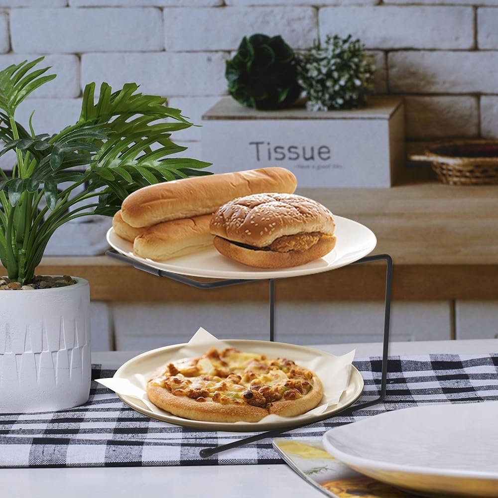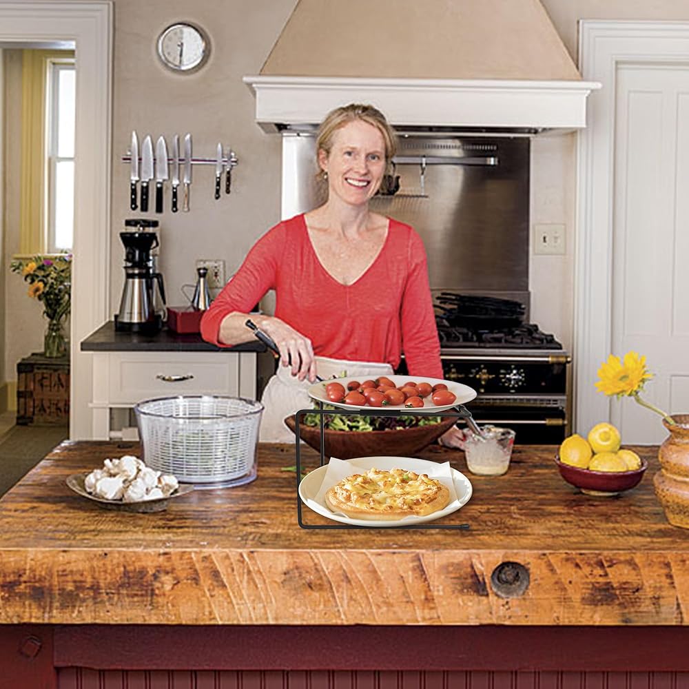 【Dimensions and Durable Material】The pizza tray riser measures 8.5 x 7.5 x 6.25in.Our pizza stands for tables are made of heavy-duty black metal wire, which is stylish and adds modern farmhouse style.We use the food-grade non-slip silicone for a tight grip on the pizza pan to prevent dropping.Hence our pizza pan risers are anti-slip, strong and sturdy, providing a stable base for your pizzas.