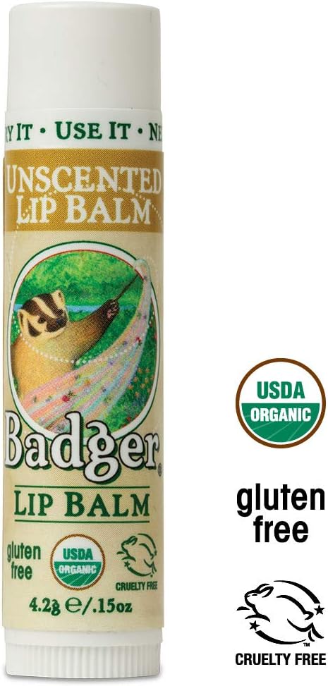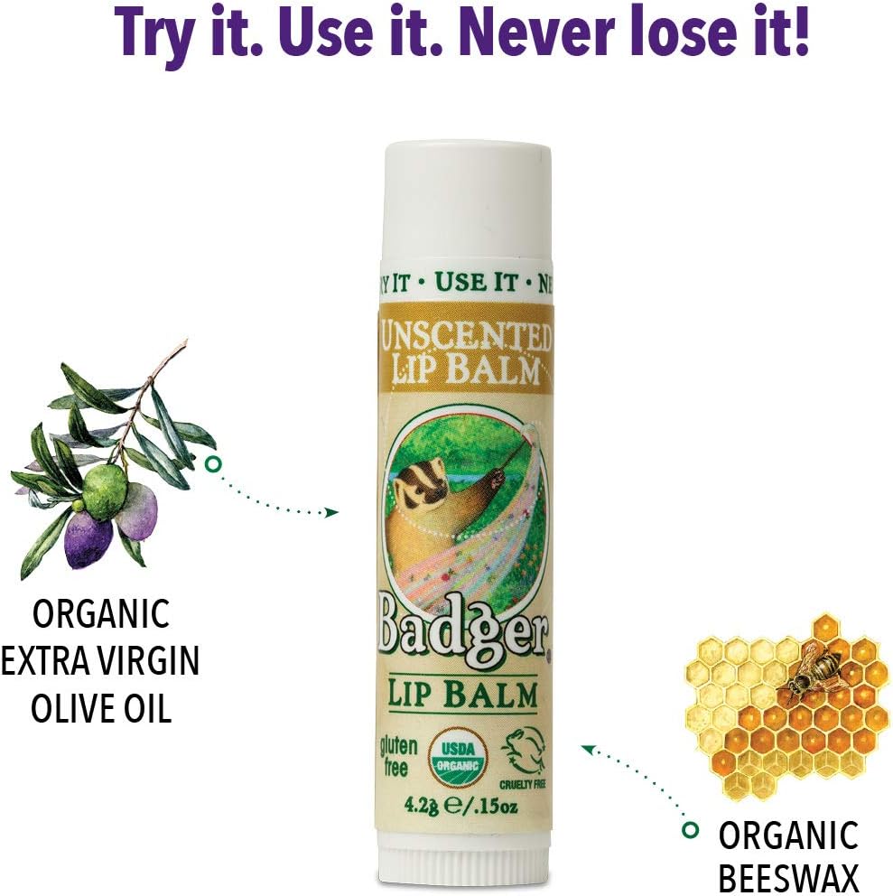Try it. Use it. Never lose it! USDA Certified Organic unscented lip balm from Badger contains organic extra virgin olive oil, beeswax, and rosemary extract to moisturize your lips while protecting them from the elements. A light texture, smooth glide, and a hint of shine make your lips feel and look great all the time. No artificial colors, flavors, or sweeteners—ever! Just a bounty of antioxidants and nourishing goodness