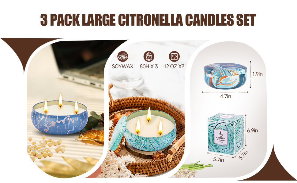 Citronella Candles Outdoor, 3 x 12oz Large Citronella Candle Sets for Home Patio Yard Garden Balcony Backyard Camping, 240hrs Long Lasting, 3 Wicks Natural Soy Wax Jar Candles Indoor
