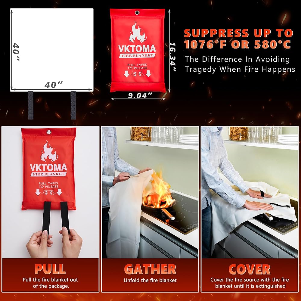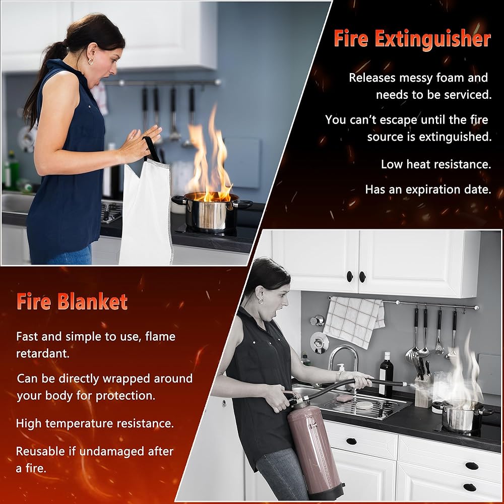【40"*40" EMERGENCY FIRE BLANKET】 Simply deploy the blanket and pull down the rings to quickly and easily extinguish the fire, unlike common fire extinguishers, it is easy to operate and does not cause any mess.