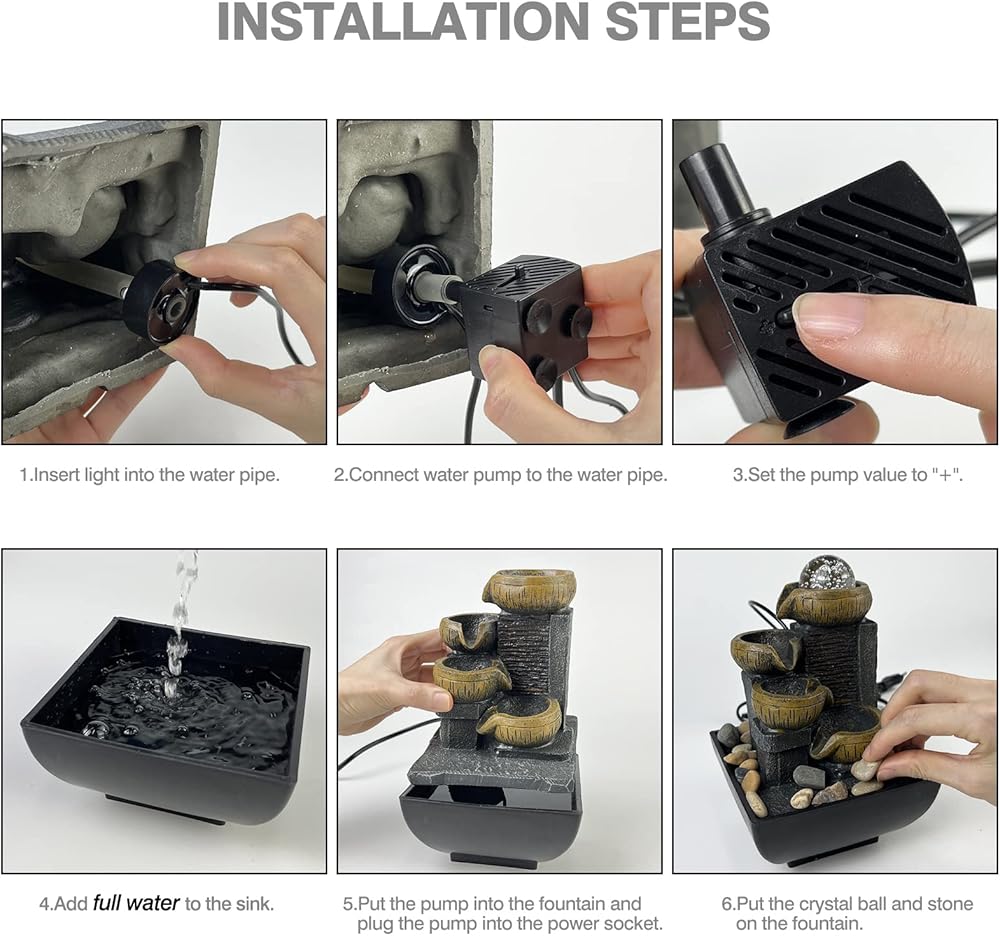 Easy to use - Just plug the LED into the hose then connect the water pump with the hose (When first use, you need to turn the switch of the water pump to "+"). Fill the base with water, and plug in the power supply to enjoy the relaxing desktop waterfall.