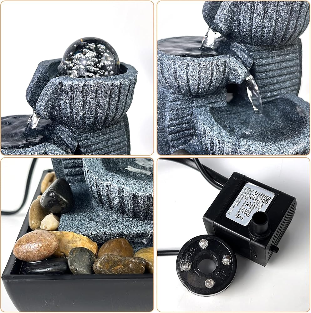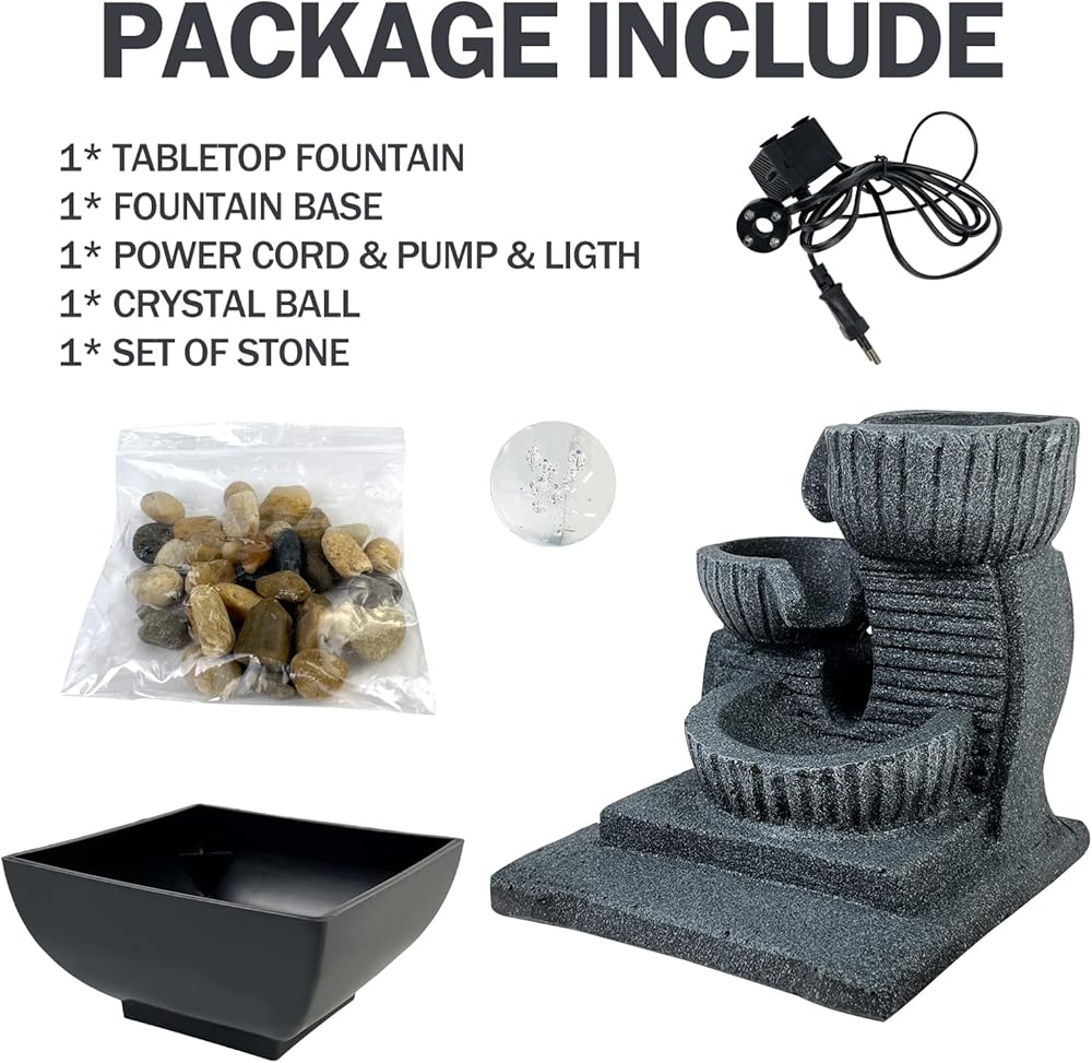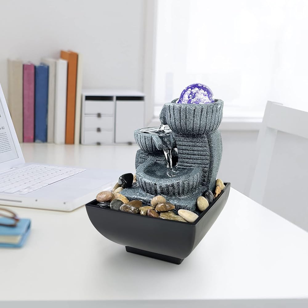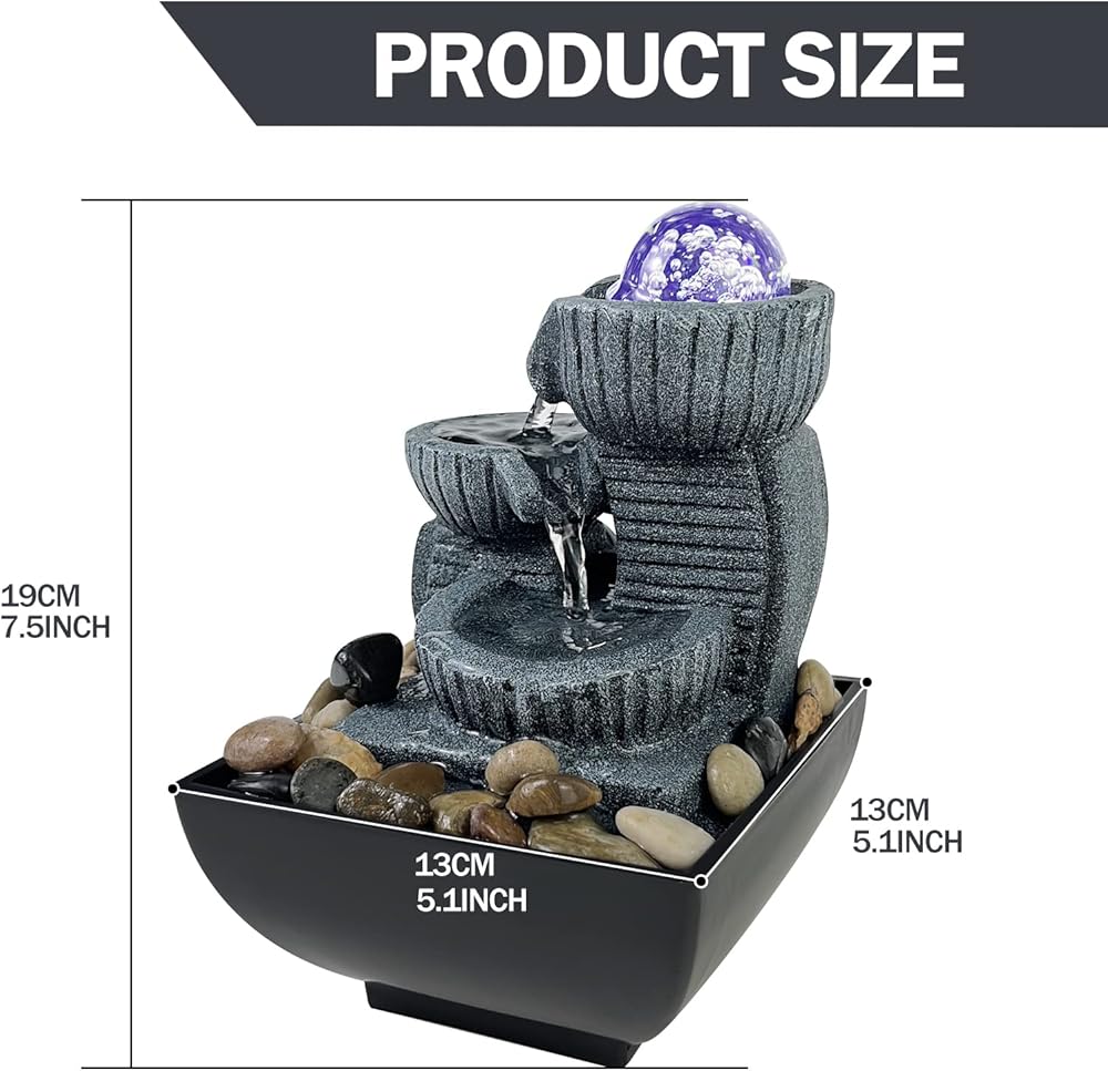 Decorative Tabletop Fountain - Bring a calming, zen, and decorative feel to any room, 3 tiers of water merging into a small waterfall, under the decoration of colored lights and rotating balls, the fountain adds beauty and tranquility. Perfect for decorating any table, desk, bedroom, bathroom or vanity in the room. Suitable to use around pool/pond/tanks/aquarium.