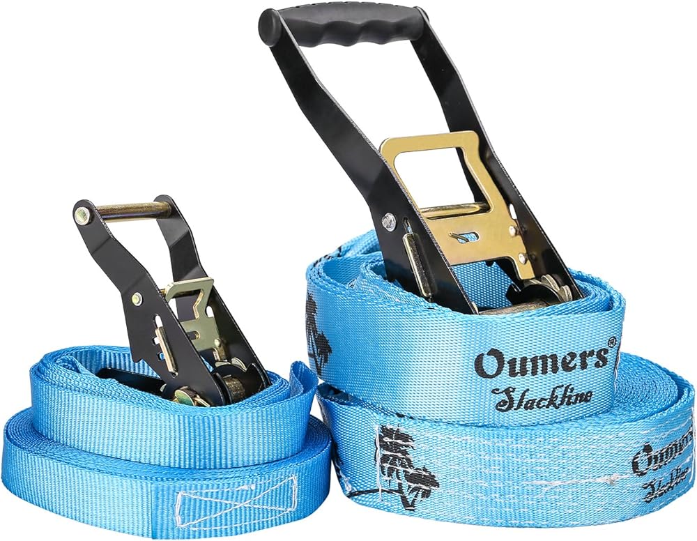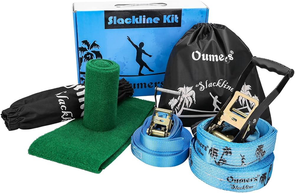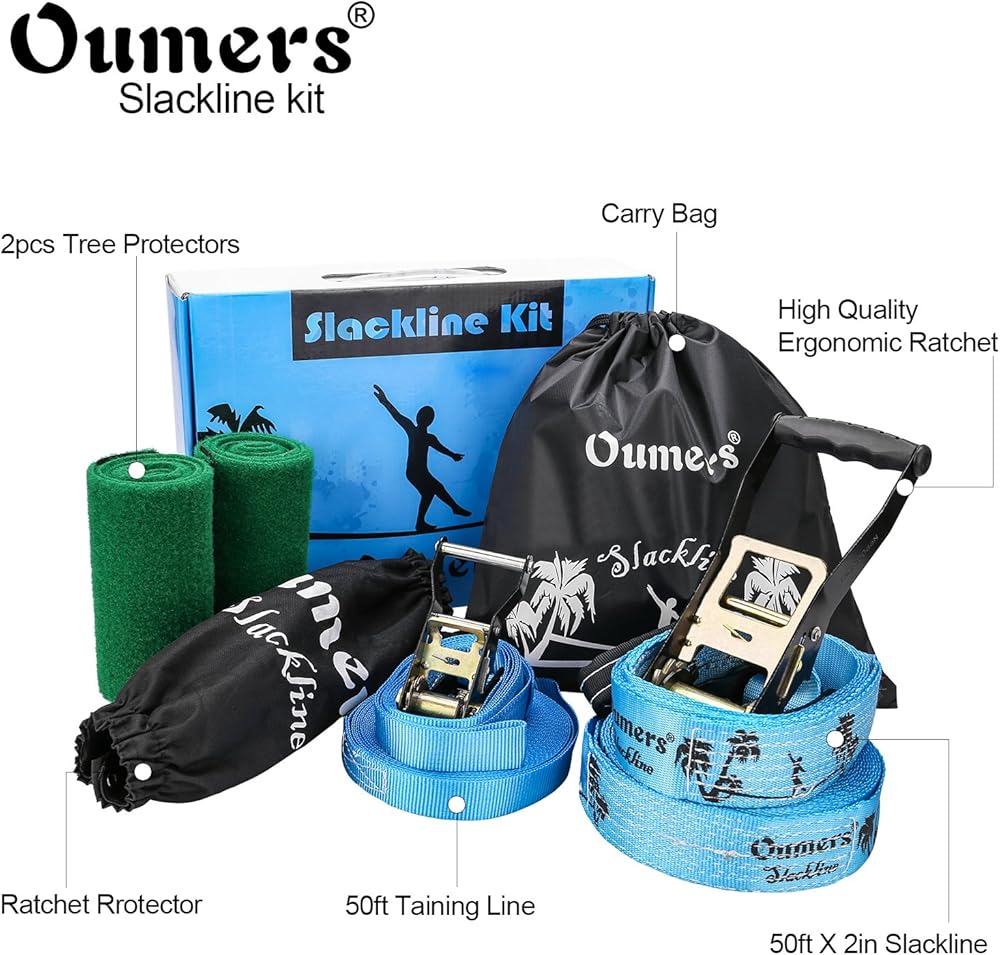 Oumers complete slackline kit features everything you need to get started: Main slack line,training line, big ratchet for main line, small ratchet for training line,one big ratchet cover, Oumers carry bag, instruction manual, gift box packing.
