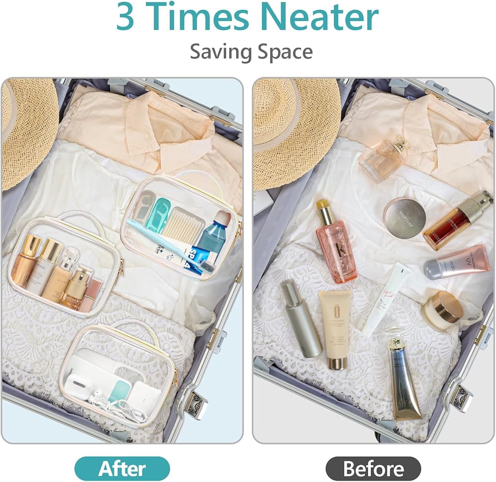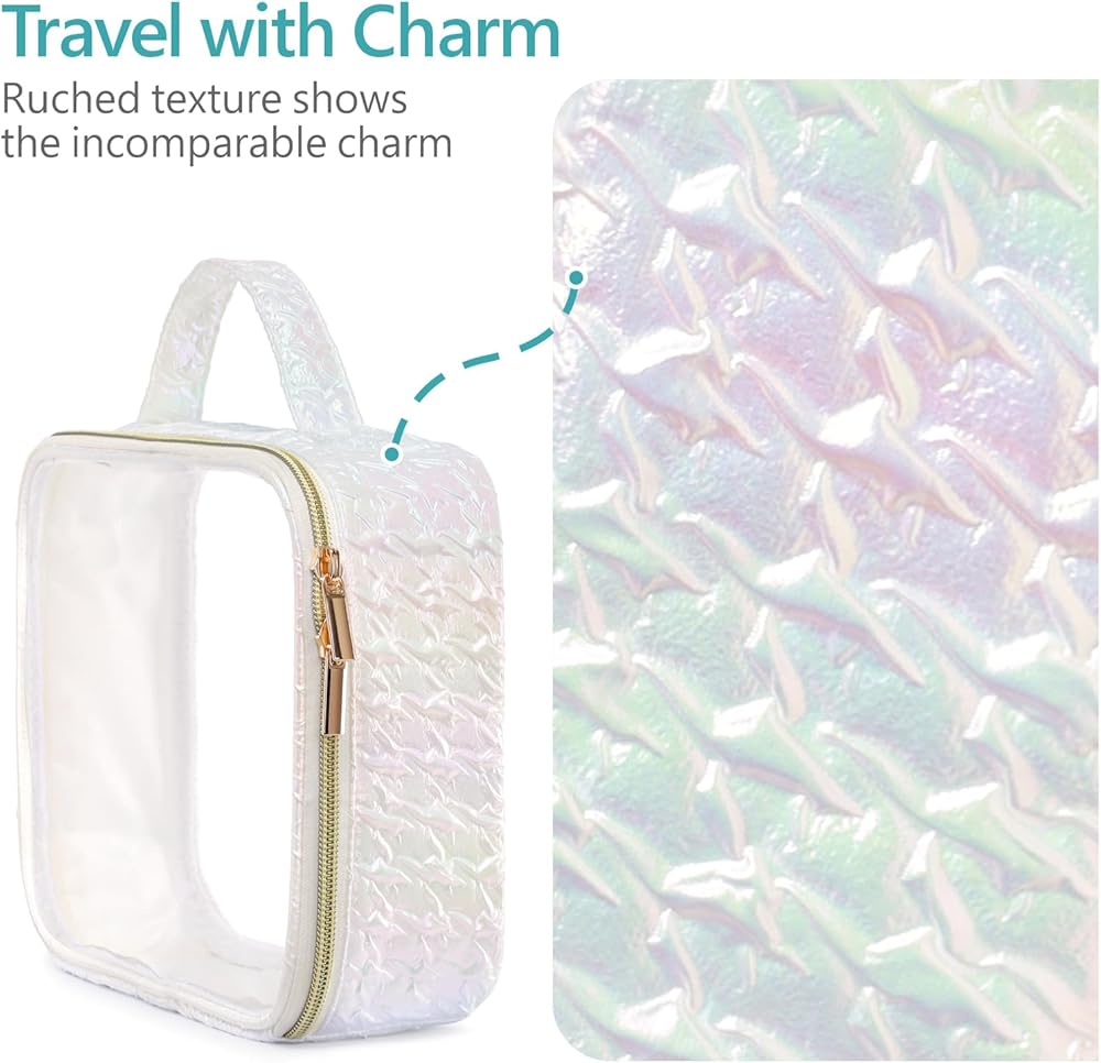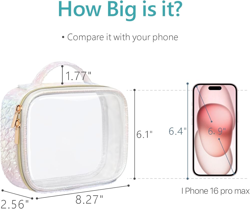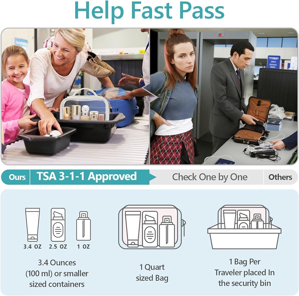TSA Approved: The medium size clear makeup bag is 7.8 x 2.3 x 5.9 inch, it follows the 3-1-1 Liquid Rule of airlines, you can quickly pass the airport security screening. Note: the large size toiletry bag is 9.8 x 3.1 x 6.6 ihch, it is larger than one quart and is not TSA approved
