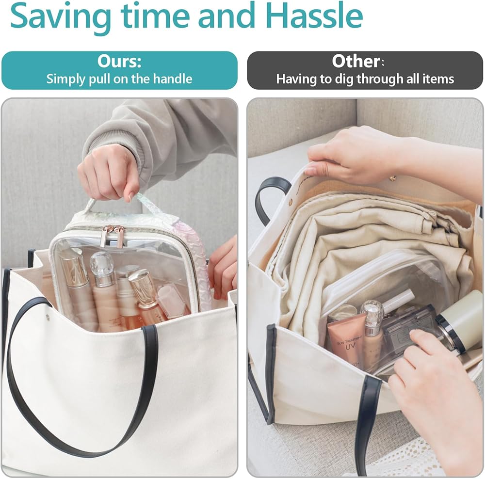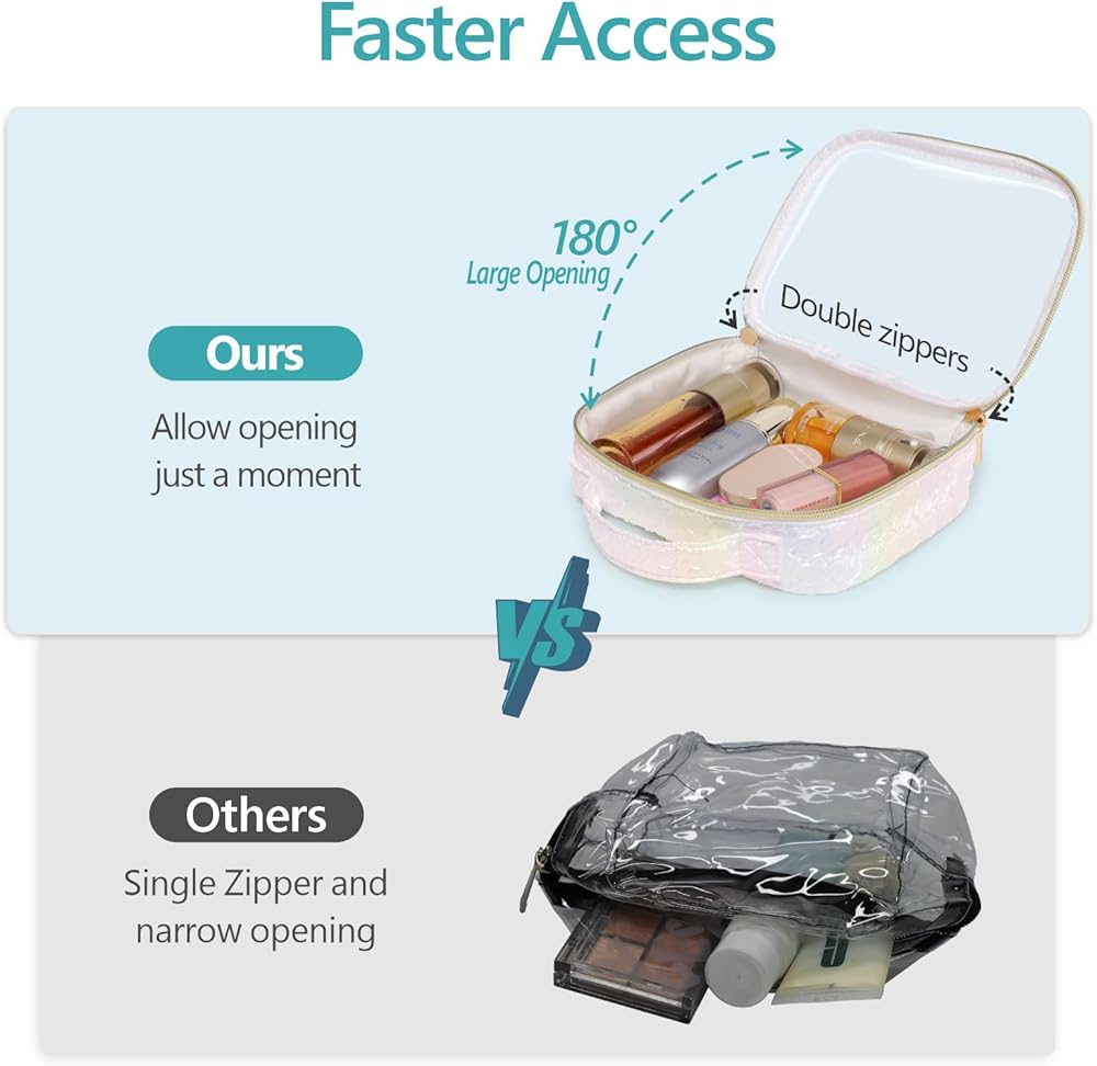 Easy to Use: Zip-around opening facilitates the access of travel essentials. Double zippers can be opened by 180%, so the clear makeup bags can be opened horizontally. And the humanized handle design allows this makeup bag to be lifted and hung, convenient to use