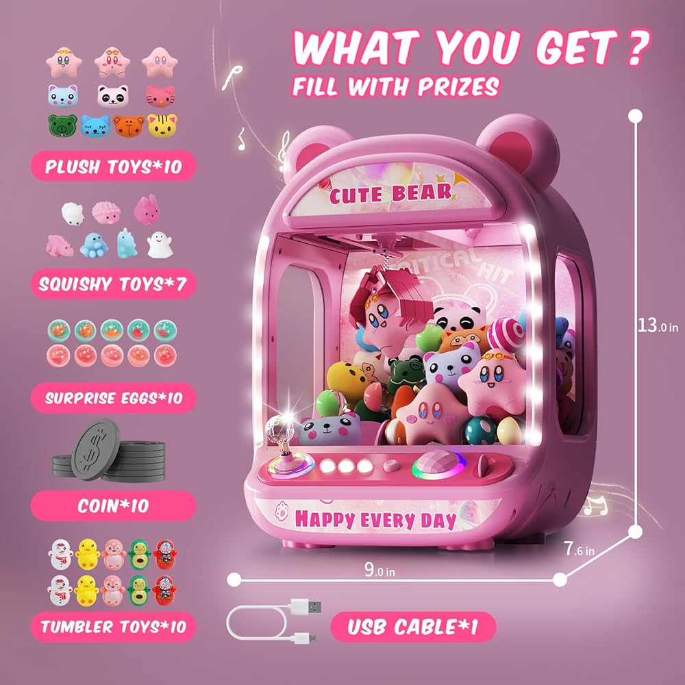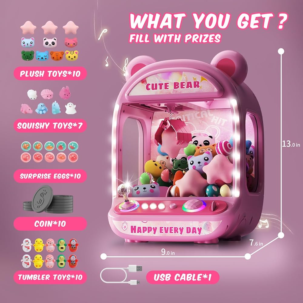 Safe and easy to use-Kids claw machine with toys inside designed with smooth edges and durable materials, claw machine toys refill plush can withstand enthusiastic play and is suitable for kids of all ages. Simply turn on the switch, insert a game coin to start the machine, and maneuver the joystick 360° to grab prizes. The USB power(included) and battery options(not included) allow you to say goodbye to dead batteries, providing endless fun at home or on the go with this gift for girls age 8-10.