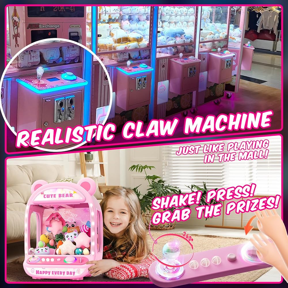 Real mini arcade game with sound effects and MUTE button - the universal joystick is uniquely designed to mimic the real claw machine experience. Enjoy endless family fun and friendly competition with our bear claw machine for Kids! Watch your kid's eyes light up with excitement as they control the claw, aiming to grab cute prizes included. It's an exhilarating experience that provides hours of fun for both kids and adults, while also exercising hand-eye coordination.