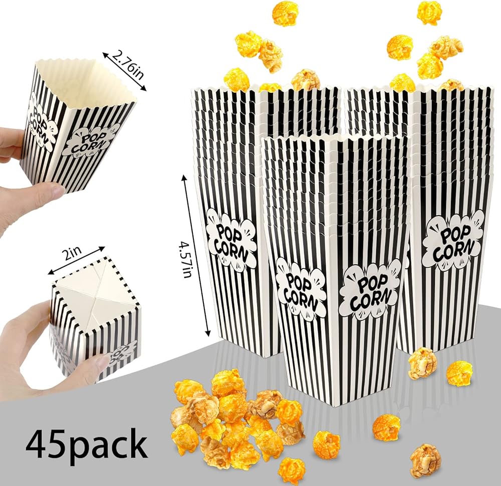 Quantity and Size: After purchasing our popcorn bags set, you will receive 45 popcorn bags. The bottom size of the popcorn boxes is 1.97 inches × 1.97 inches(50 × 50mm), the top dimension is 2.75 inches × 2.74 inches, the capacity of the popcorn bags is suitable for holding your food, such as popcorn, cookies, candy and other snacks