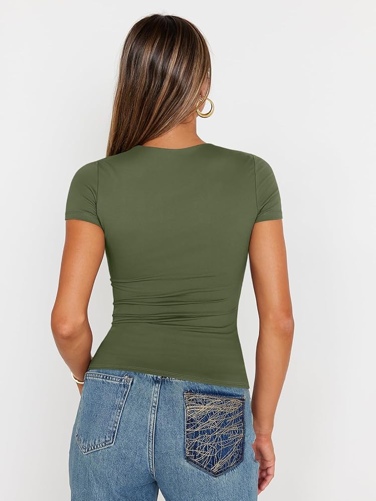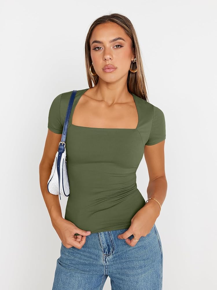 Versatile Styling Options: The square neck fitted short-sleeve top is a versatile wardrobe staple that can be styled in multiple ways. Pair it with high-waisted pants or skirts for a polished office look, or dress it down with denim shorts for a relaxed yet stylish weekend ensemble. It effortlessly transitions from day to night, making it a must-have piece for any fashion-forward individual.