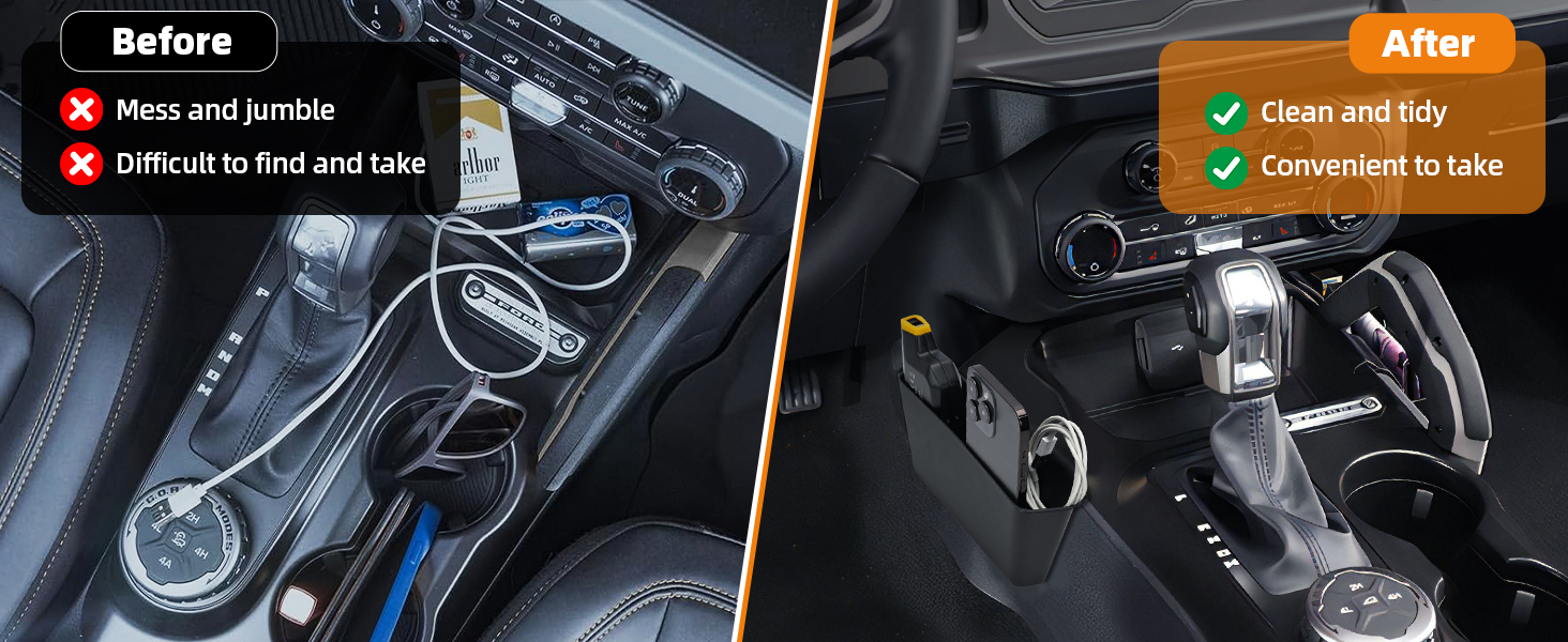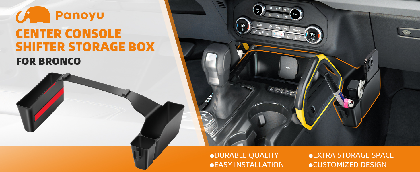 【SPECIAL DESIGN】Bronco center console shifter storage box not only add space but also does not occupy passengers legroom, and not affect seat move forward. The box adopts partition design, keep those small items organized.