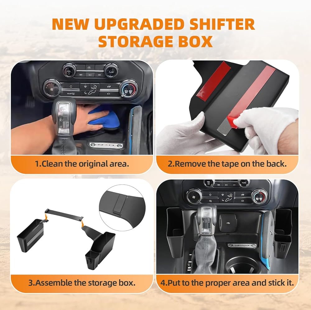 【EASY AND QUICK INSTALLATION】Directly install the Bronco gear storage box within 5 minutes and no any tools or modifications required. Tear off the adhesive on the back of Bronco center console organizer, and place it on the front of the gear shifter. Double-sided tape will fix the box more firmly and keep it in place while driving.