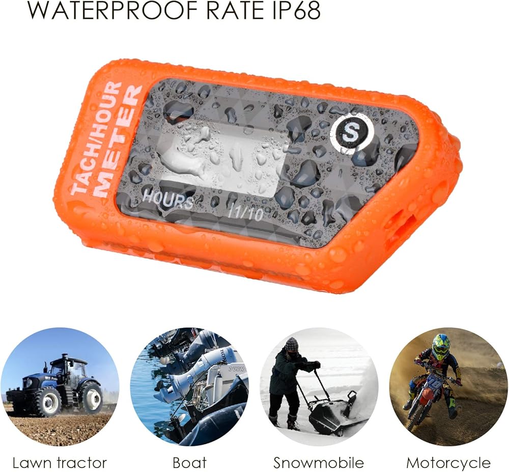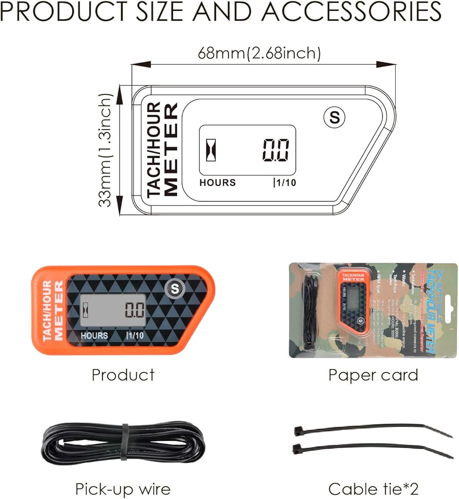 INSTALLATION---- Easy to install, no wiring required, or connection with the enclosed hardware, this tachometer records gasoline engine's total running hours and RPM by getting the induction from spark plug cable when engine starts.