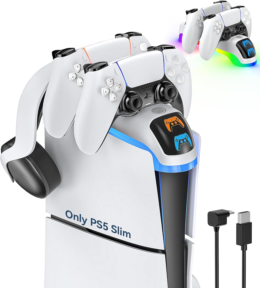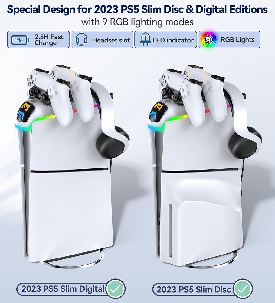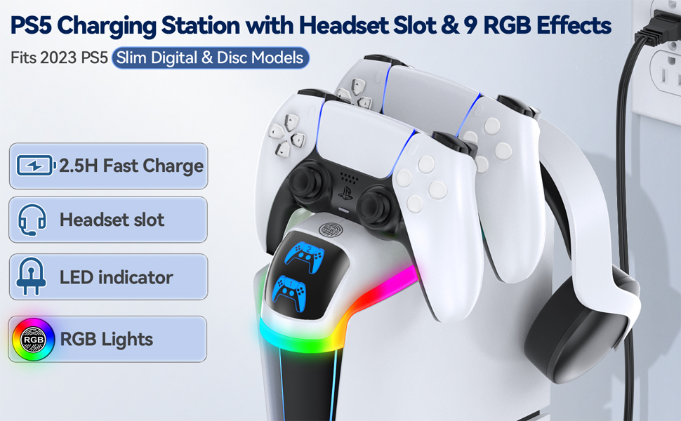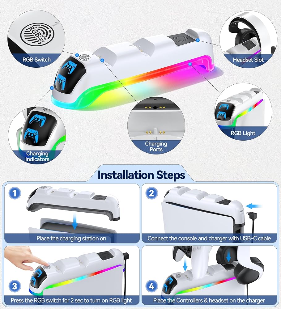 🎮【Easy Installation and Use】: PS5 controller charger station takes just 3 minutes for anyone to complete the installation. Firstly, place ps5 charger station on the PS5 Slim console, then use the included USB-C cable to power dualsense charging station. Long-press for about 2 seconds to activate the RGB lights. PS5 charging dock not only charges your PS5 controllers but also accommodates one PS5 headset. The icon on the front screen displays the controller's charging status, orange indicating charging, and blue indicating fully charged or standby mode.