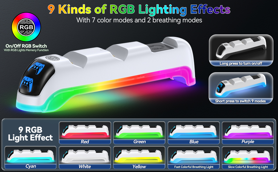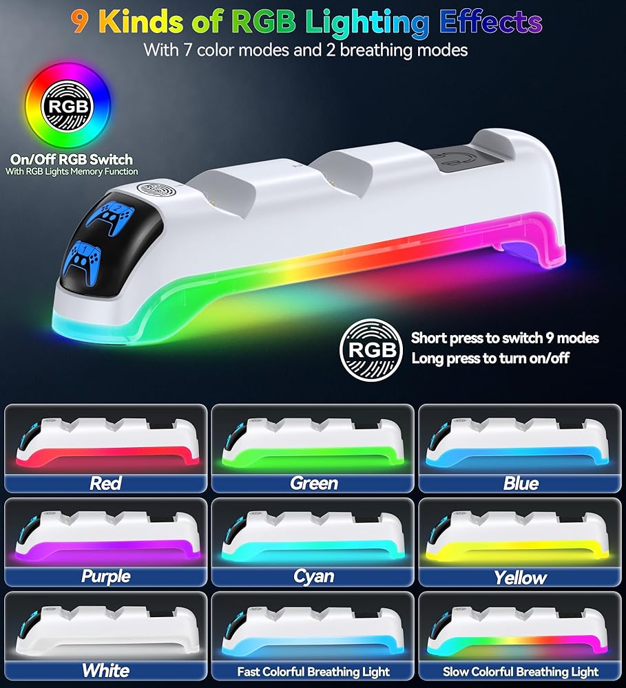 🎮【RGB Ambient Light】: PS5 controller charger placed on the top of the PS5 Slim console, simultaneously charging two PS5 controllers. There's an RGB light ring around the base of ps5 charging station, creating an immersive and relaxing atmosphere. The RGB offers 9 modes, including red, orange, yellow, green, cyan, blue, purple, fast flash, and slow flash. Easily switch light modes with a touch-sensitive button, and long-press to turn the light on or off. ps5 charger also features a memory function, automatically restoring the previous mode upon reopening.