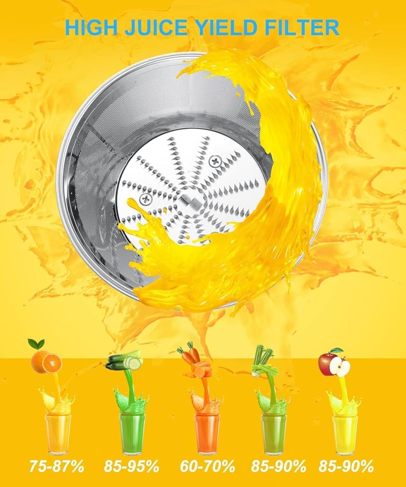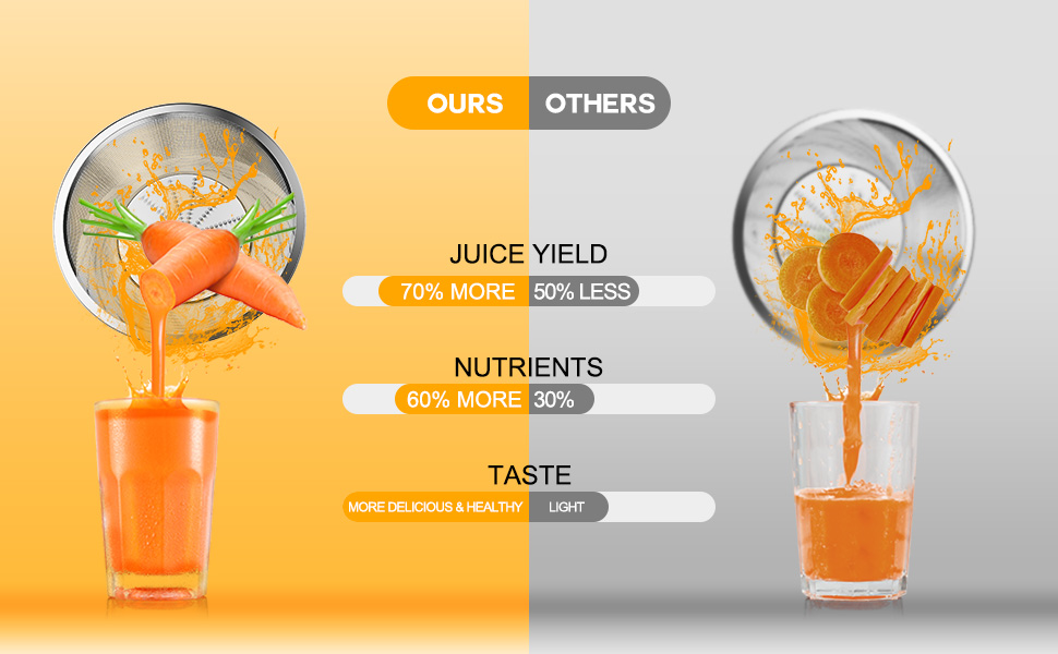 🍉【High Juice Yield】The combination of 304 stainless steel high density filter in the juicer and corrosion resistant multi-blade ensures high juice yield. Which produces 25% higher juice yield and 35% more vitamins than other machine.