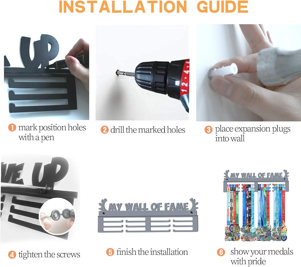 Never Give Up Medal Holder Display Hanger Rack Frame,Super Sturdy Black Steel Metal, Wall Mounted Sports Medals