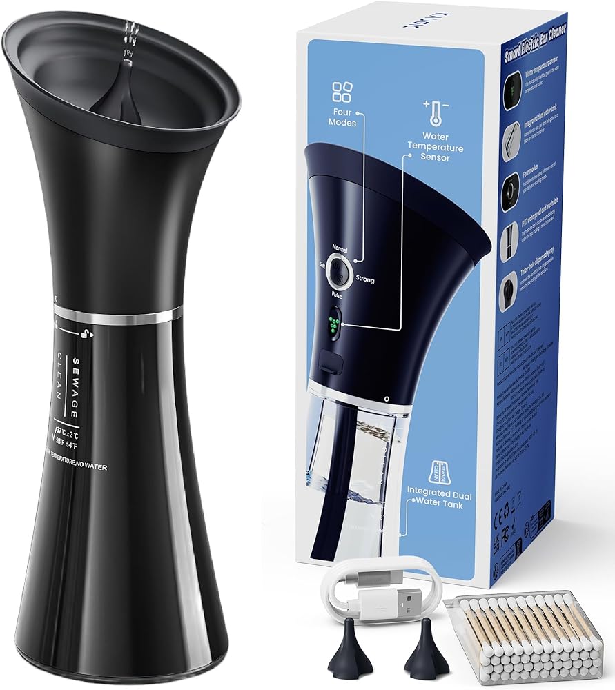 Upgraded Ear Wax Removal with One-Piece Waste Tank, Safe Cleaner with Water Temperature Sensor, Effective Ear Irrigation Kit & USB-A to C Cable, IPX7, Black