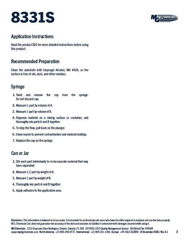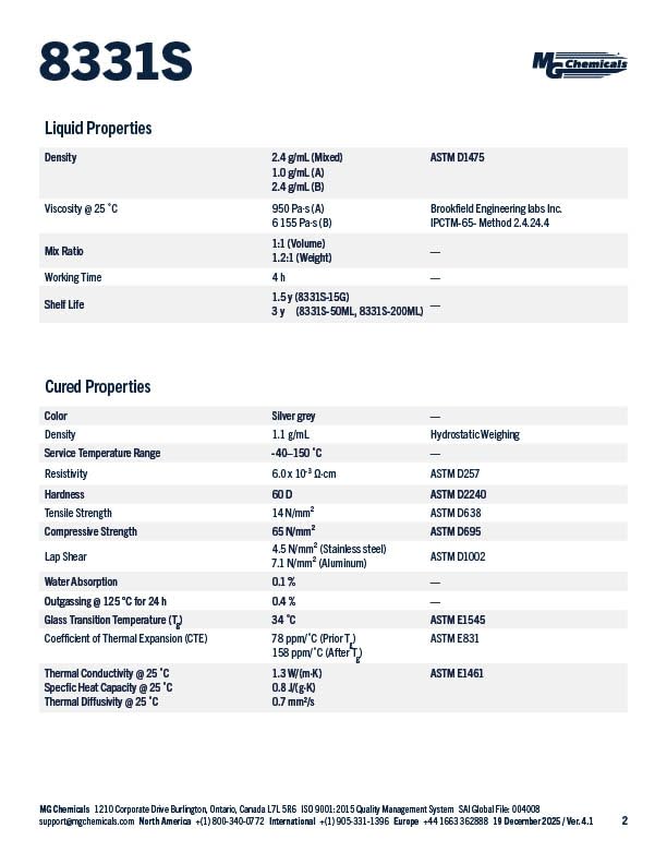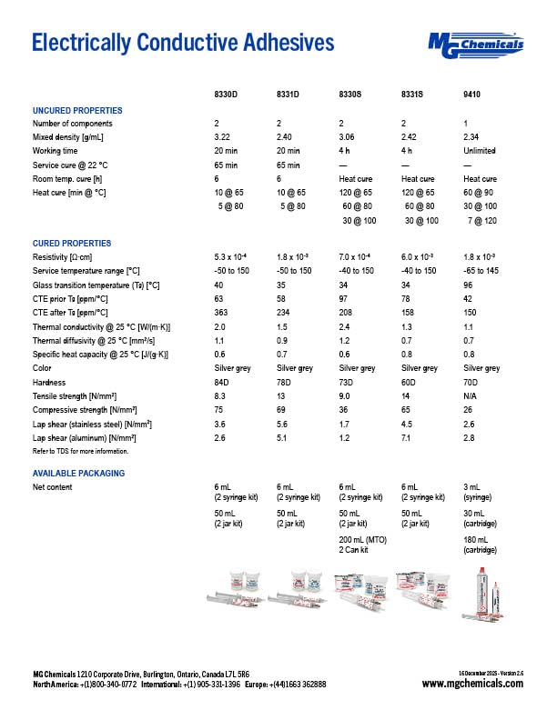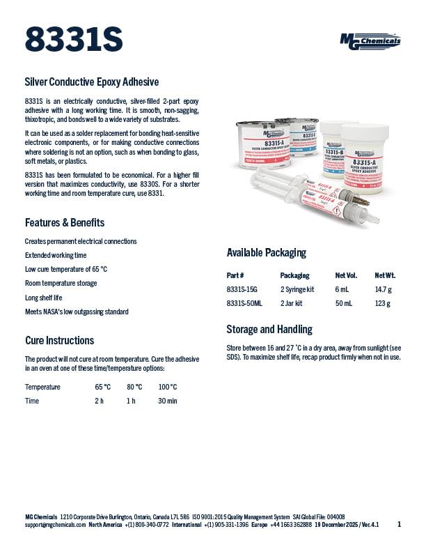This is a two-part, smooth, silver paste that cures to form a hard, durable polymer that is highly conductive, both electrically and thermally. It adheres strongly to metals, glass, and well to most plastics used in electronic assemblies. It has a convenient 1-to-1 ratio, and a long 4 hour working time. Heat is required for proper cure ( 2 hours at 65°C) The mixed adhesive essentially acts like a 1-part adhesive for 4 hours. Unlike 1-part adhesives, however, it does not require high curing temperatures or frozen storage, and it has a very long shelf life. Applications and uses: The 8331S is used as a solder replacement for bonding heat-sensitive electronic components and for making conductive bonds where solder is not an option, such as when bonding to glass, soft metals or plastics. It allows for quick cold soldering repairs of electronic devices, makes excellent thermal connections, provides excellent EMI/RFI shielding, and is very effective at filling in seams between metal plates. It is useful in applications where the high cure temperatures of 1 part epoxy systems can potentially damage components. Its primary applications are in assembly of electronic devices. It is used in the automobile, aerospace, marine, communication, instrumentation, and industrial control equipment industries, and is widely used by hobbyists and makers.