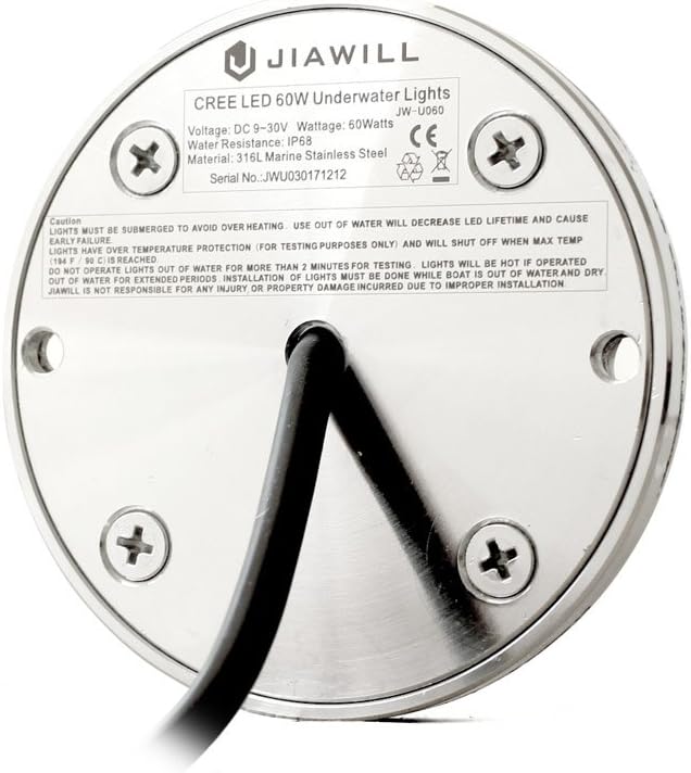 The 60-watt underwater LED boat light operates within a wide 9-32V DC range. Installation hardware is included for surface-mounting on a variety of transom types