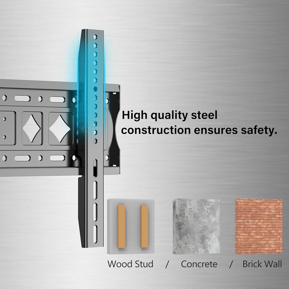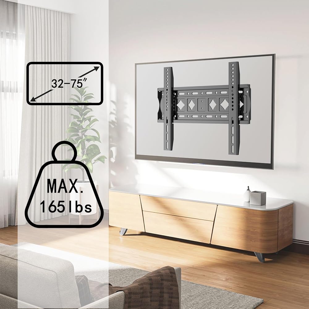 Stable & Durable TV Mount :A good structure makes TV mounting stable and secure. This TV monitor mount features a minimalist design with solid holding power. By using cold rolled steel, our tv mount can support TV weight up to165lbs (75KGs) with heavy-gauge TV plate to keep your TV stay stably in place.