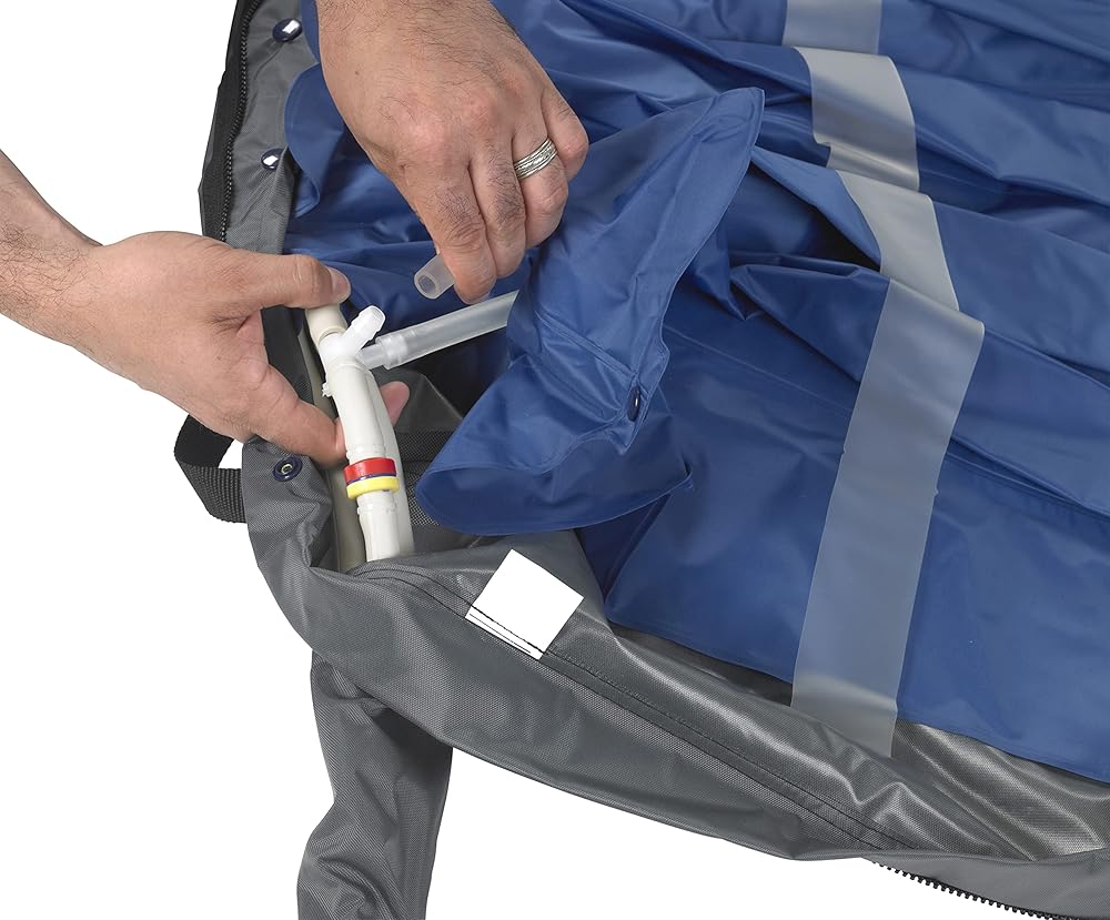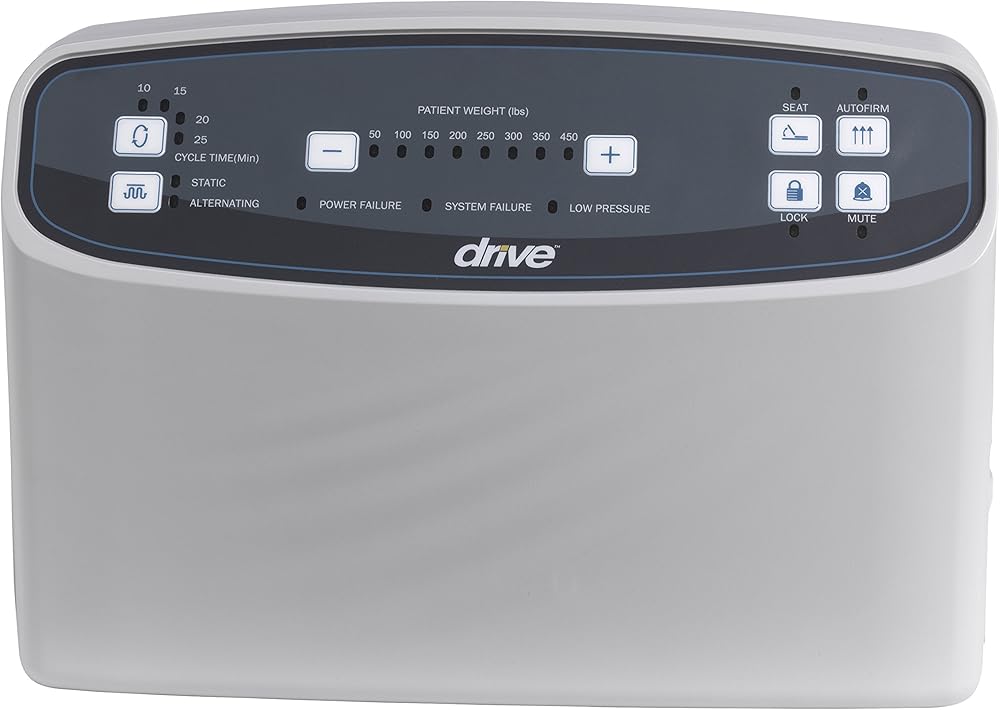 Drive Medical Med-Aire Alternating Pressure and Low Air Loss Mattress Replacement System is indicated for the prevention and treatment of all stages of pressure ulcers. This feature-rich group 2 support surface offers alternating pressure therapy and microclimate control, optimizing pressure redistribution and helping to maintain skin integrity, tubing quickly and easily disconnects with EZ Lock / Quick Release design. An intuitive 8LPM (liters per minute) control unit provides 4 cycle time options: auto-recovery, seat inflation, micro processing feedback, 3 diagnostic alarms, and comfort settings easily adaptable to the patient's specific needs. Designed to administer alternating pressure and low air loss therapy, this mattress has head to toe durable air cells with pillow function for comfort; cell-on-cell technology for power outage protection; and a low-shear, anti-friction, fluid-resistant durable stretch cover. Includes CPR valve that allows rapid deflation.