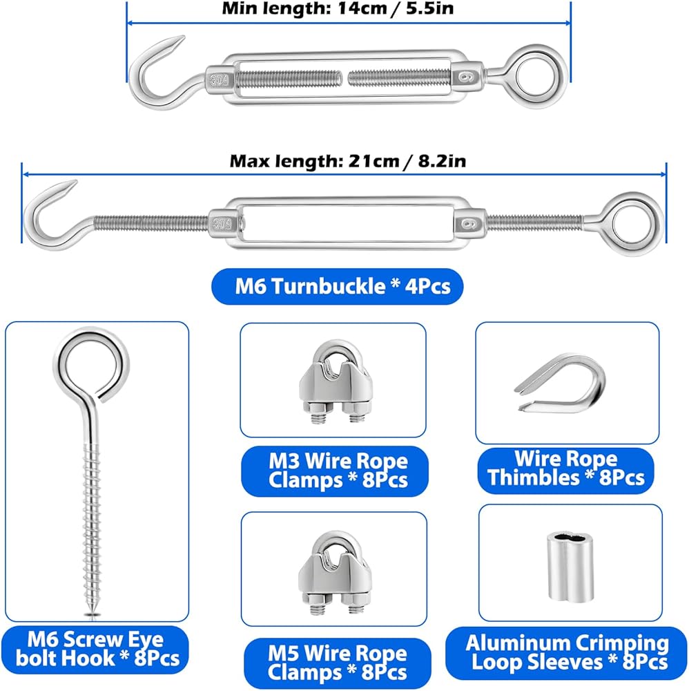 【Turnbuckles for Cables Wire】M6 Turnbuckle Kit for Cable Tensioner made of T304 stainless steel ,never rust,offers good corrosion resistance and rust resistance; crimping loop sleeve are made of aluminum, hard and sturdy, Turnbuckle perfect for tightening up metal cable, trellis wire,clothes line tensioners,rope tightener,guy wire.