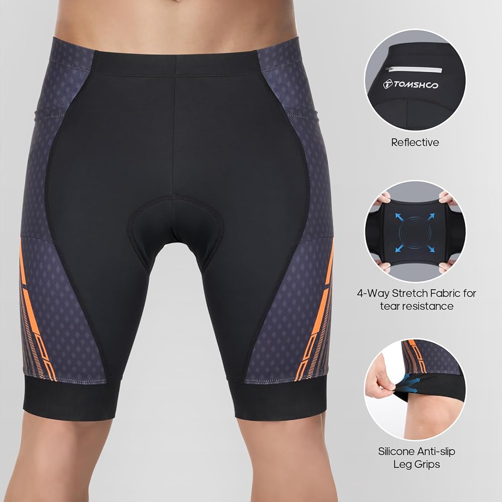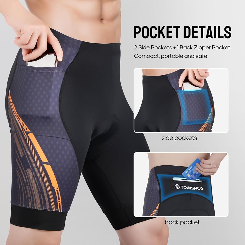 [FUNCTIONAL DESIGN]: The side and back pockets of the TOMSHOO cycling shorts provide plenty of space for storing and accessing small items, reflective strips on the back increase safety while riding, and silicone particles on the hem of the shorts ensure that your legs remain stable while riding.
