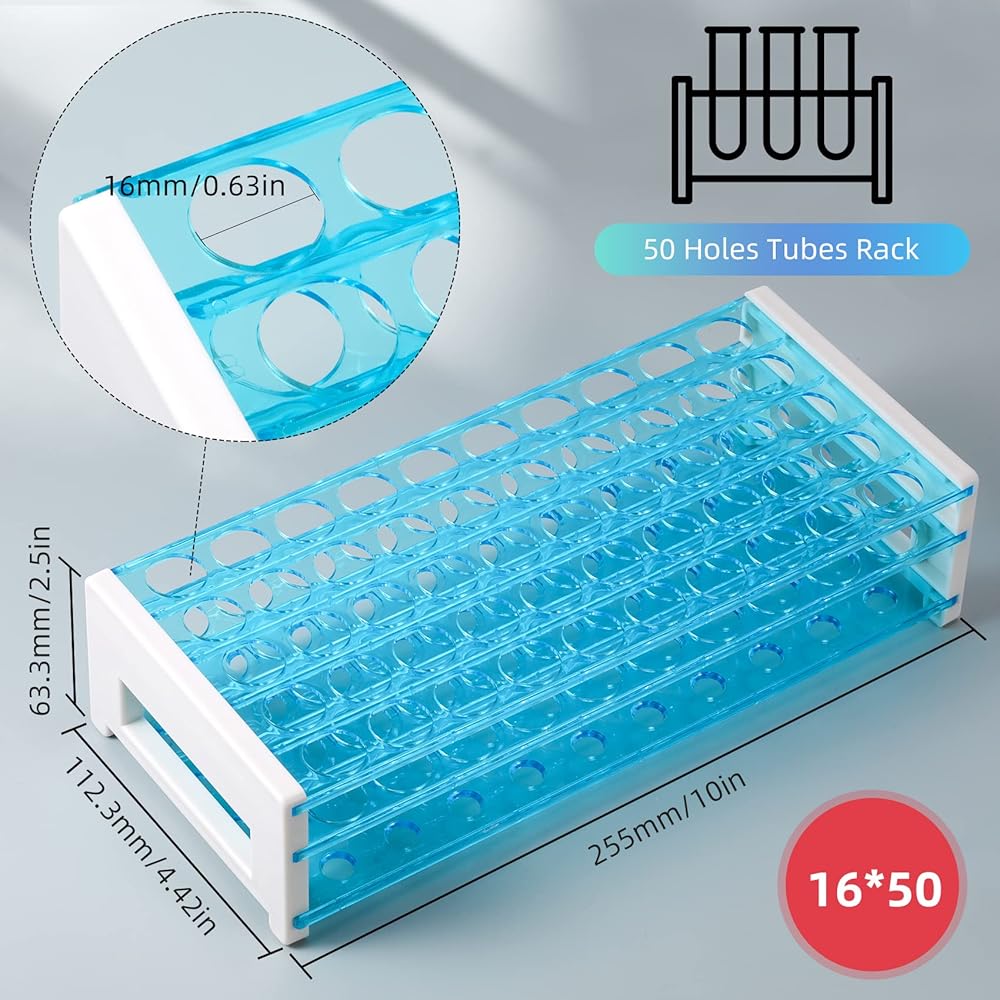 ✔ Specifications: Test tube holder rack with 50-holes, suitable for storing 13/16/18mm-diameter test tubes(Choose the right size).The tube holder tray has 3 layers of holes with a smallest hole at the bottom to keeps the tubes perfectly upright and steady.